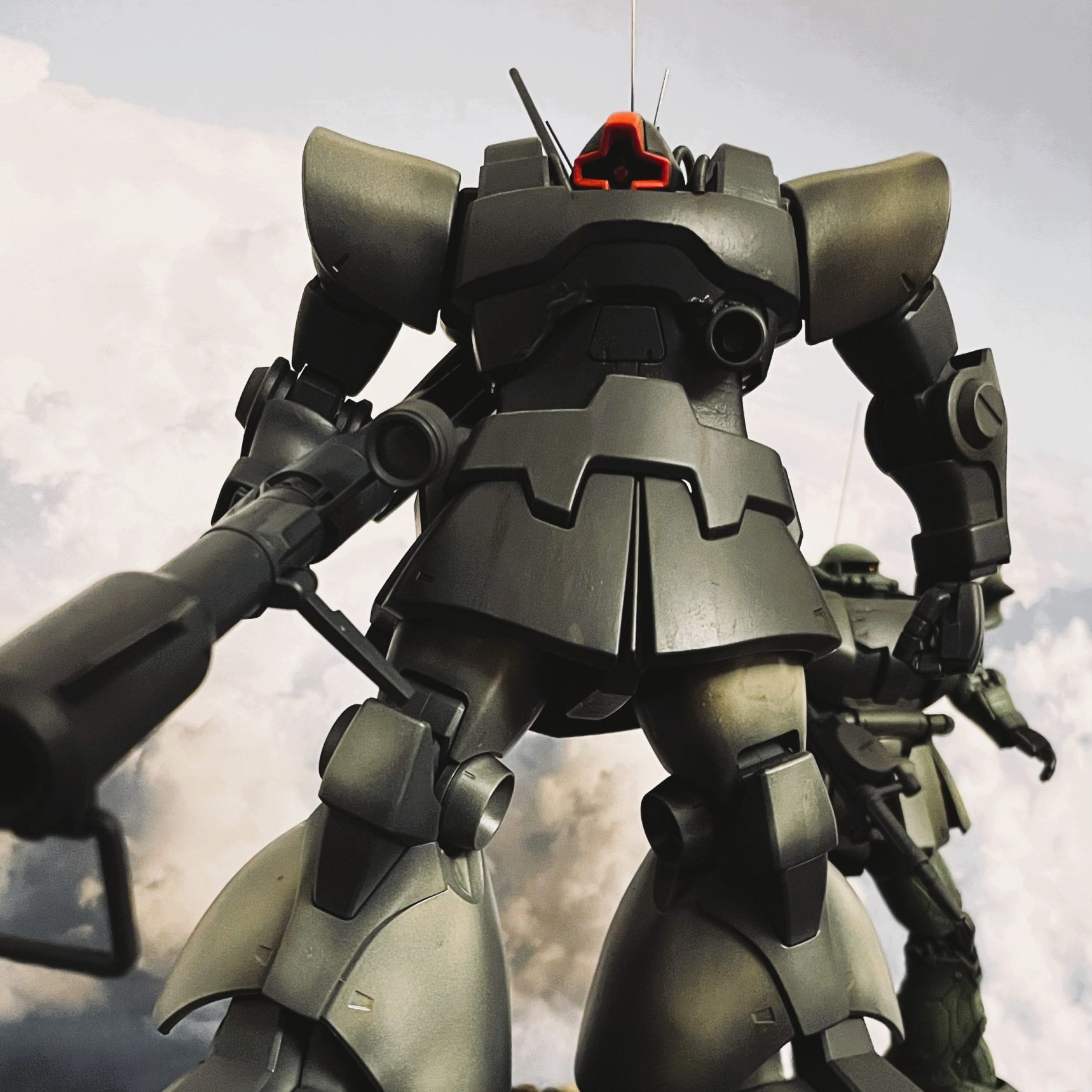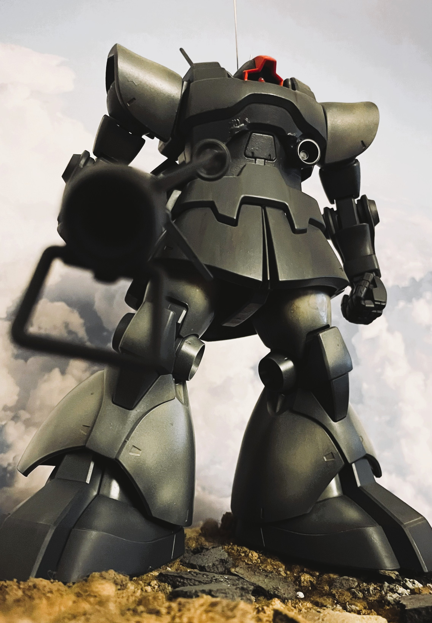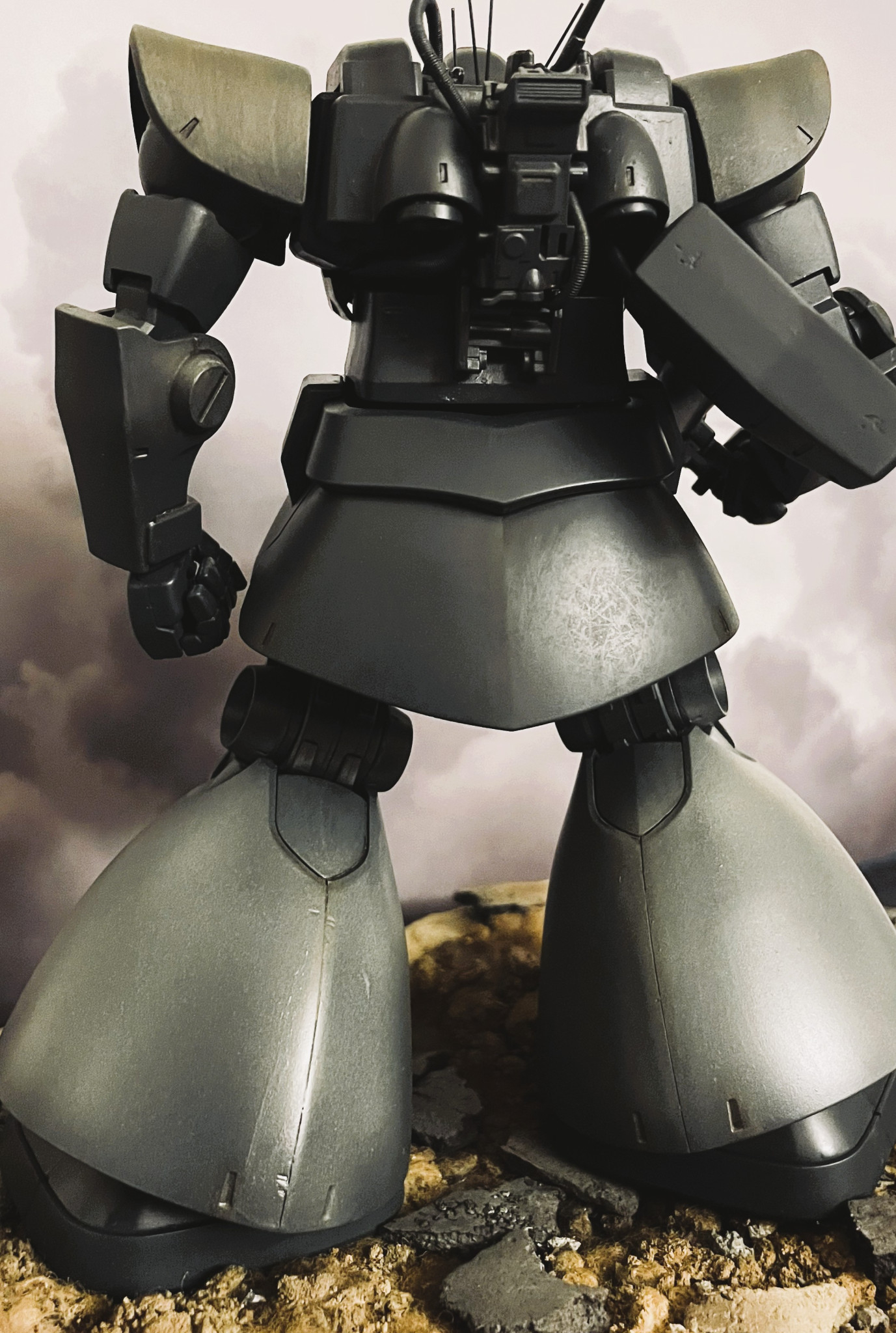 MS戦記のアレンジをイメージしたドムです。MGキットを使用しています。頭部回り及びバックパックを劇中のイメージに近づけるべく修正しています。後方にHGザクIIを配置しています。