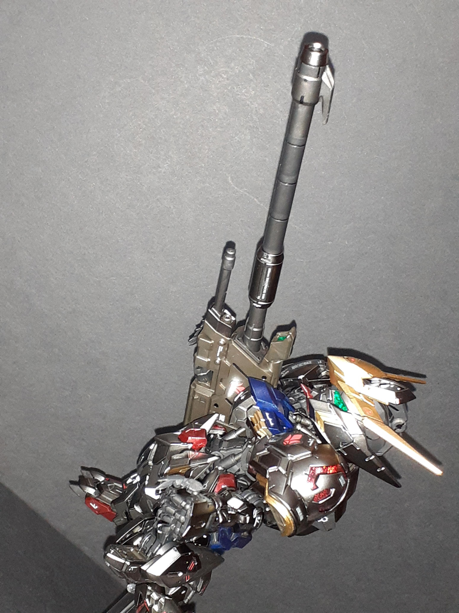 本来白成型色のパーツが鉄っぽい質感のメッキ処理されているだけではなく、赤、青、黄、瞳以外のクリアパーツも単色になっており、そのまま組むと全身鉄の塊のようなカラーリングになります。それをそれぞれ本来のカラーリングのメタリックカラーで塗装、光沢トップコートしました。
