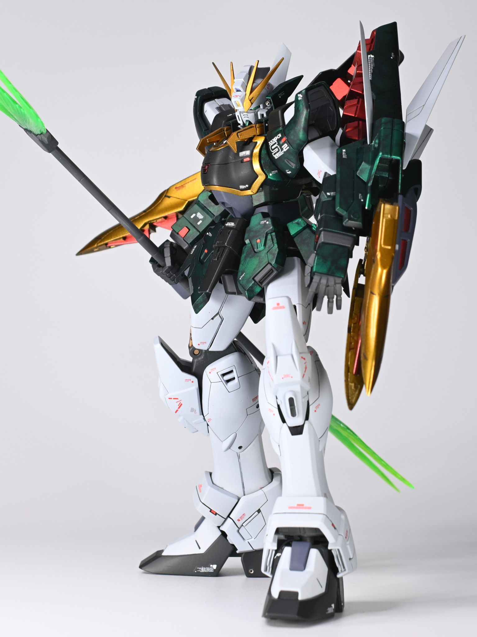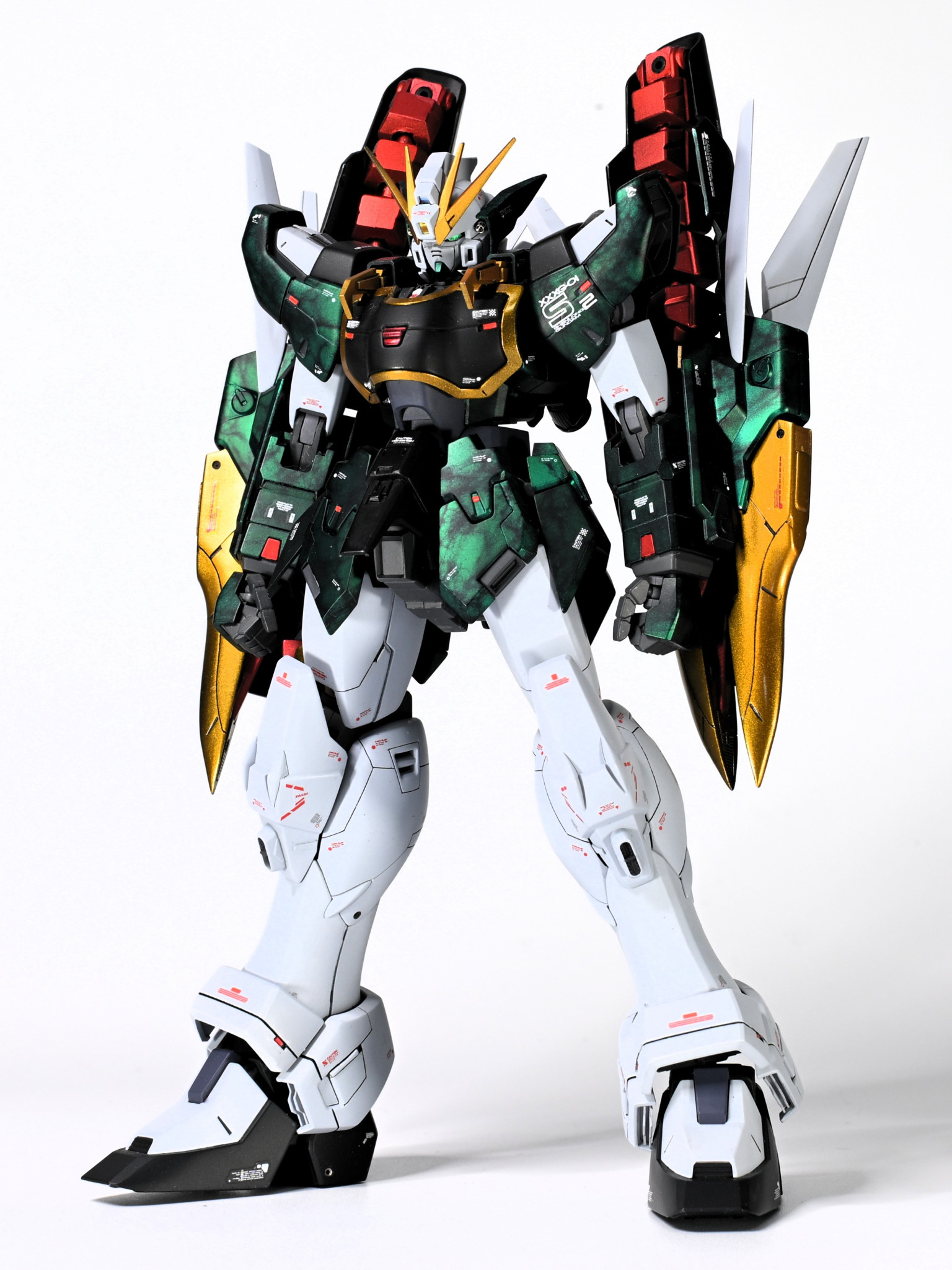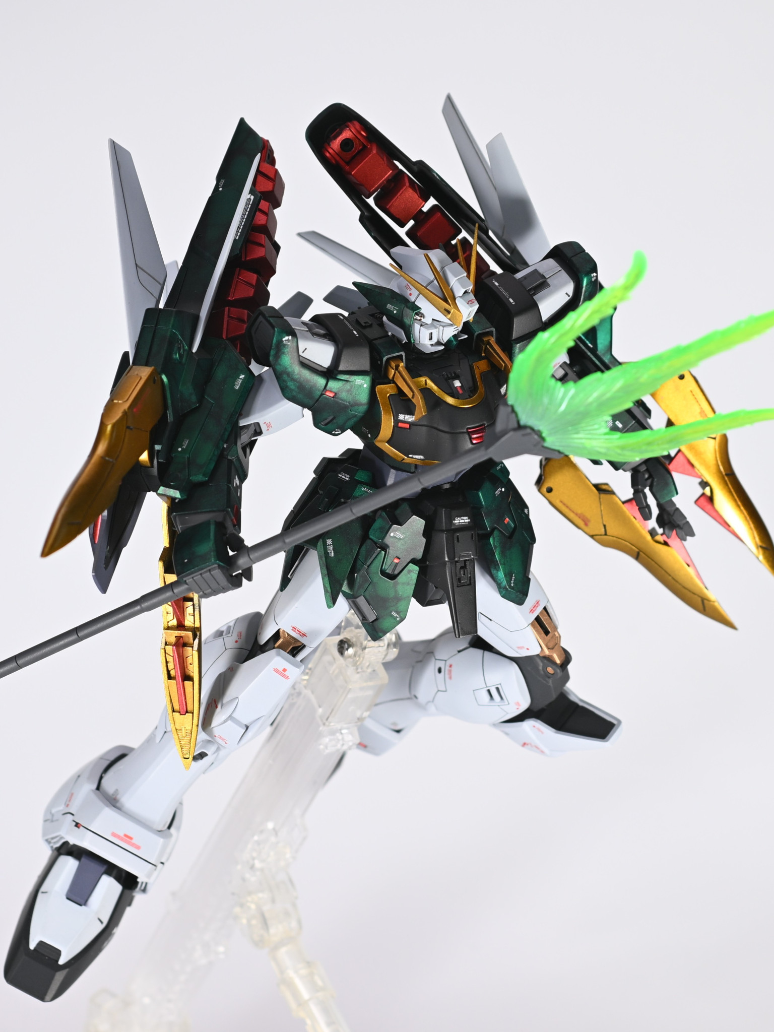 スタイルは、腹部で2mm延長。膝カバーが離れすぎていたのでフレームを一部削って太腿に近づけるように加工。首は延長せず、首のカバーを一部削り顎を引けるようにしています。鎖骨のフックのようなディテールは爪のような意匠に変更。レッドポイントで緑が映えるようにしています。