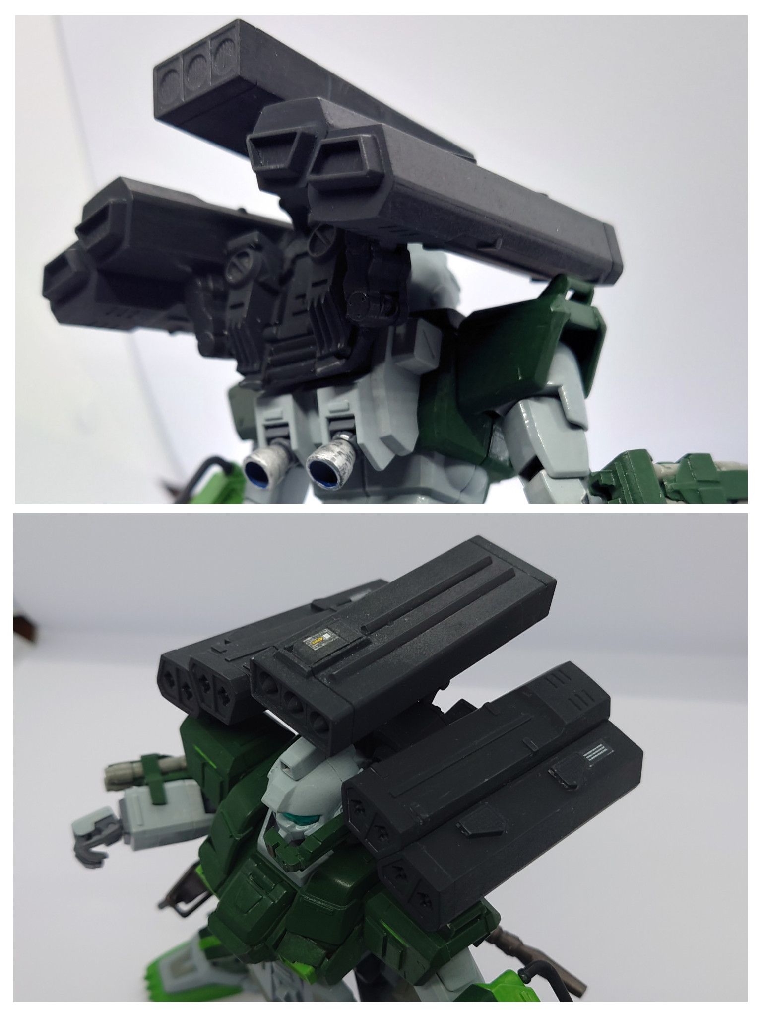 センター部分はザクの脚部ミサイルポッドをプラ板で延長、基部はシャンクパーツの組み合わせで作って、ネオジウム磁石で元のバックパックに被せてます