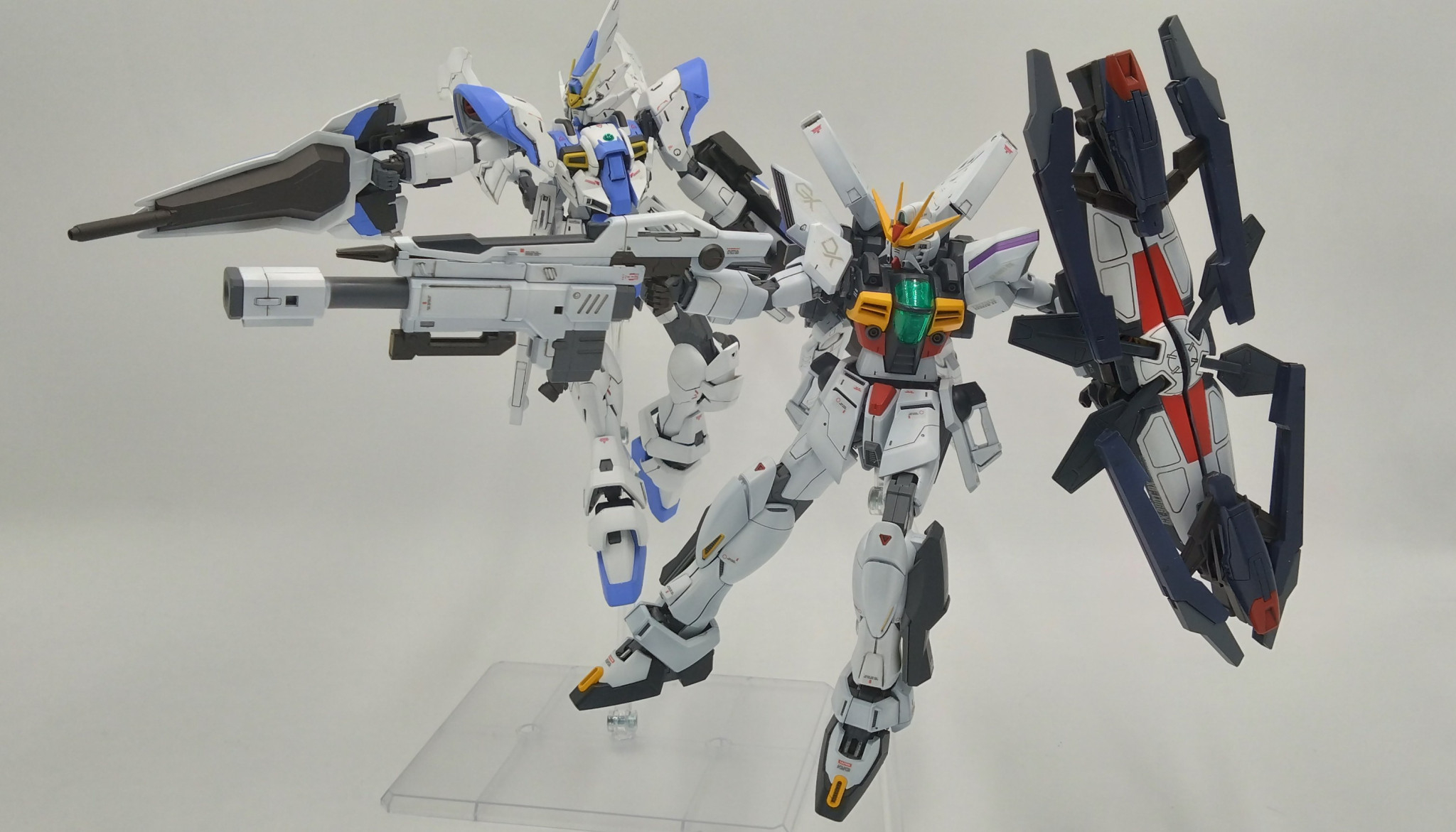 本機二体の初陣は謎の教団が秘匿で隠していたあのカリスにとっての因縁の巨大MAパトゥーリアがエスタルドに襲撃すると報告にこの二人の若きガンダムパイロットが出撃した。二人の連携によりものの瞬間で敵雑魚バルチャーMS群とパトゥーリアを撃破した。