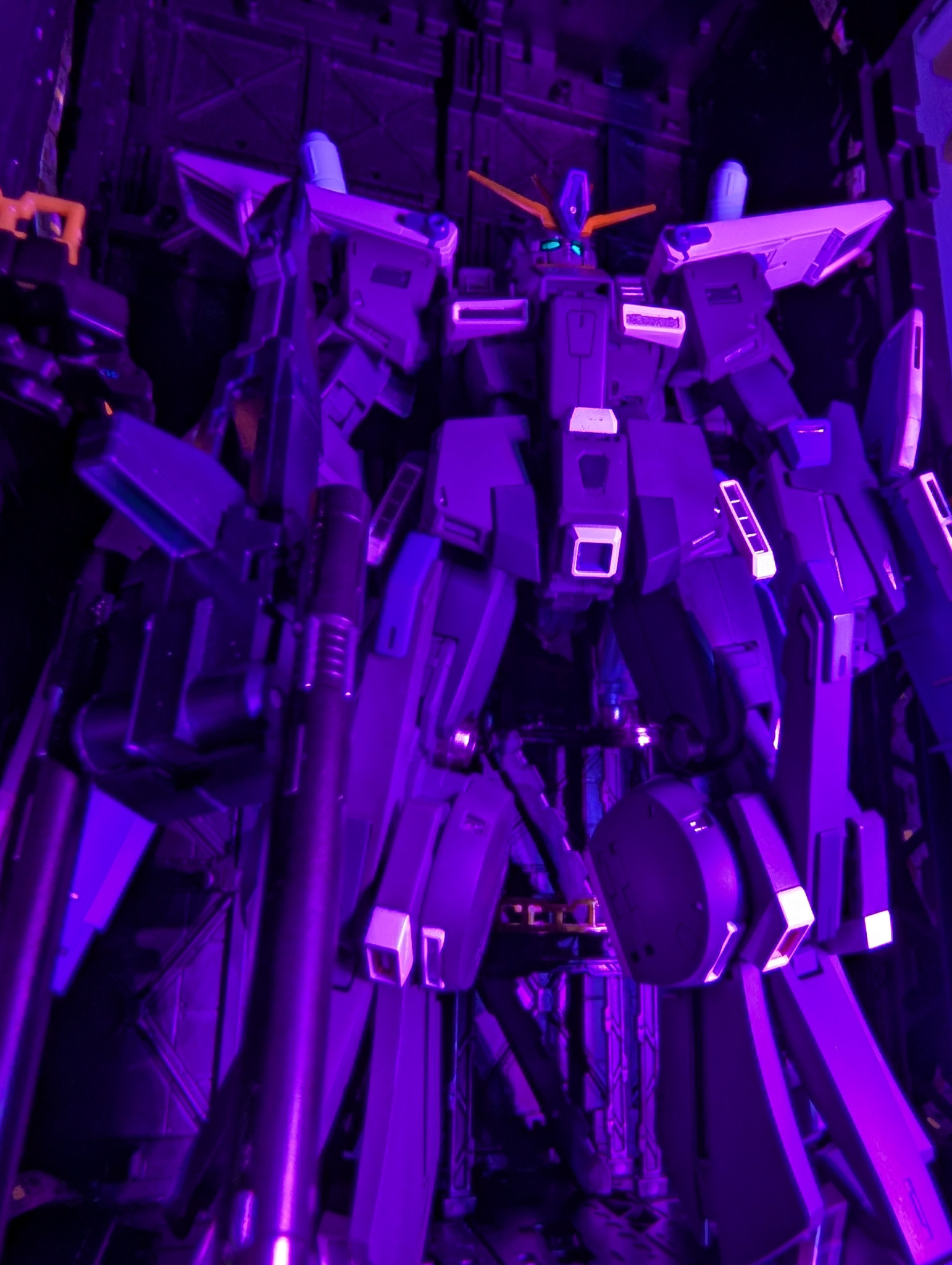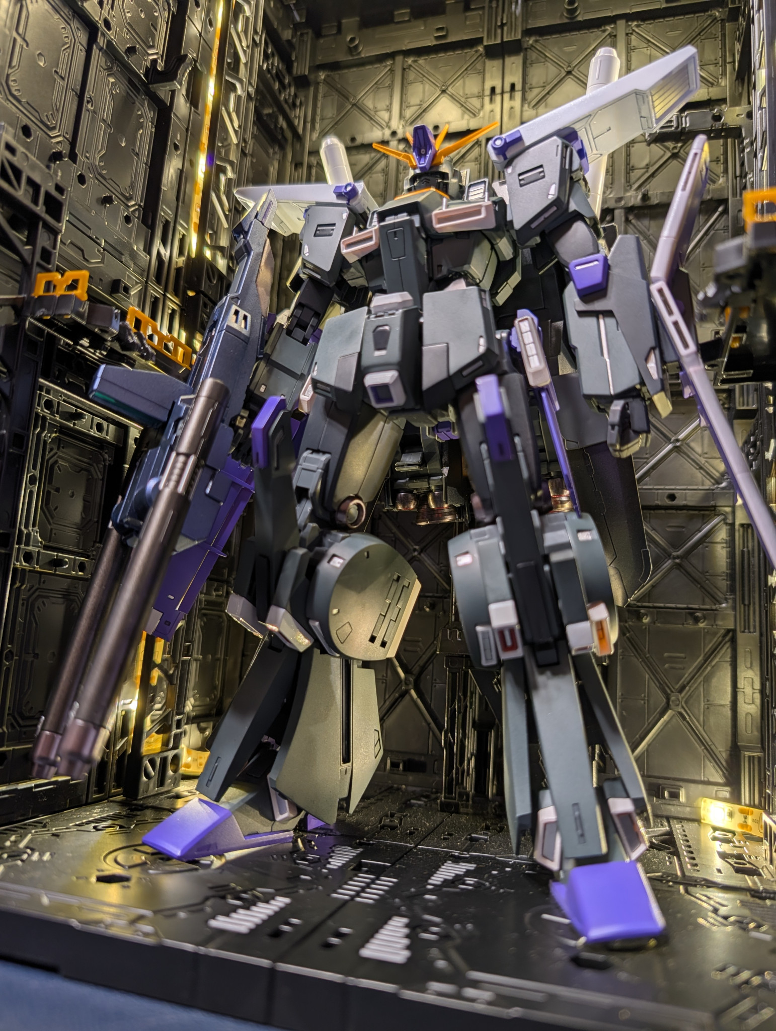 全体はジオングレーても、一部同じジオンのマーカーセットに入ってる濃い目のファントムグレーでアクセントに。紫はハイニュー向けのパープル、アンテナはメタリックオレンジ、スラスターからのチラ見えはシャインシルバーにしてます。