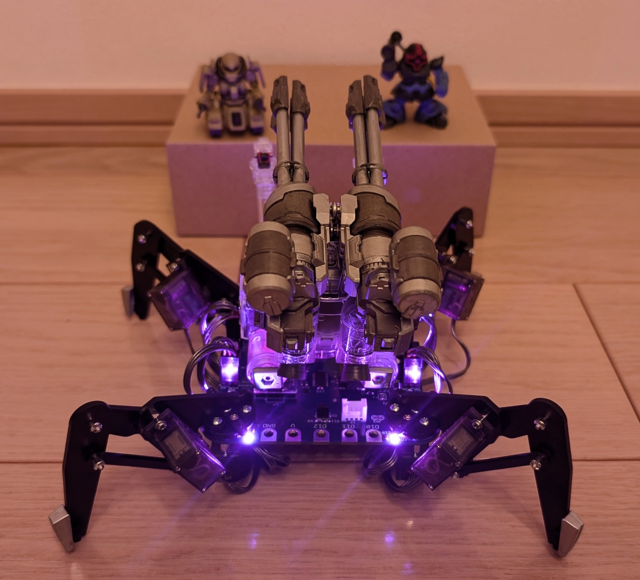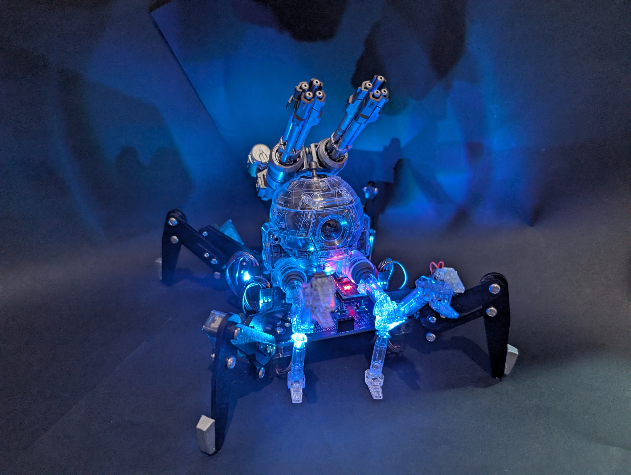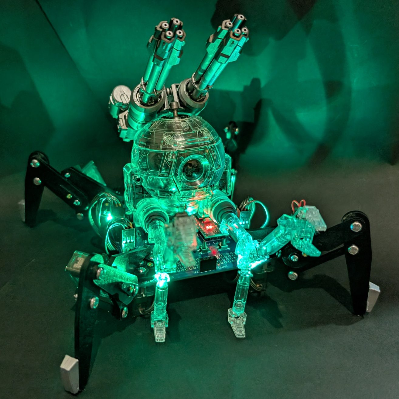 ベースのマシンはこちら。四足歩行ロボット「クアッド・クローラー」です。クモのようにカニのようにウネウネ動きます。光りながら。