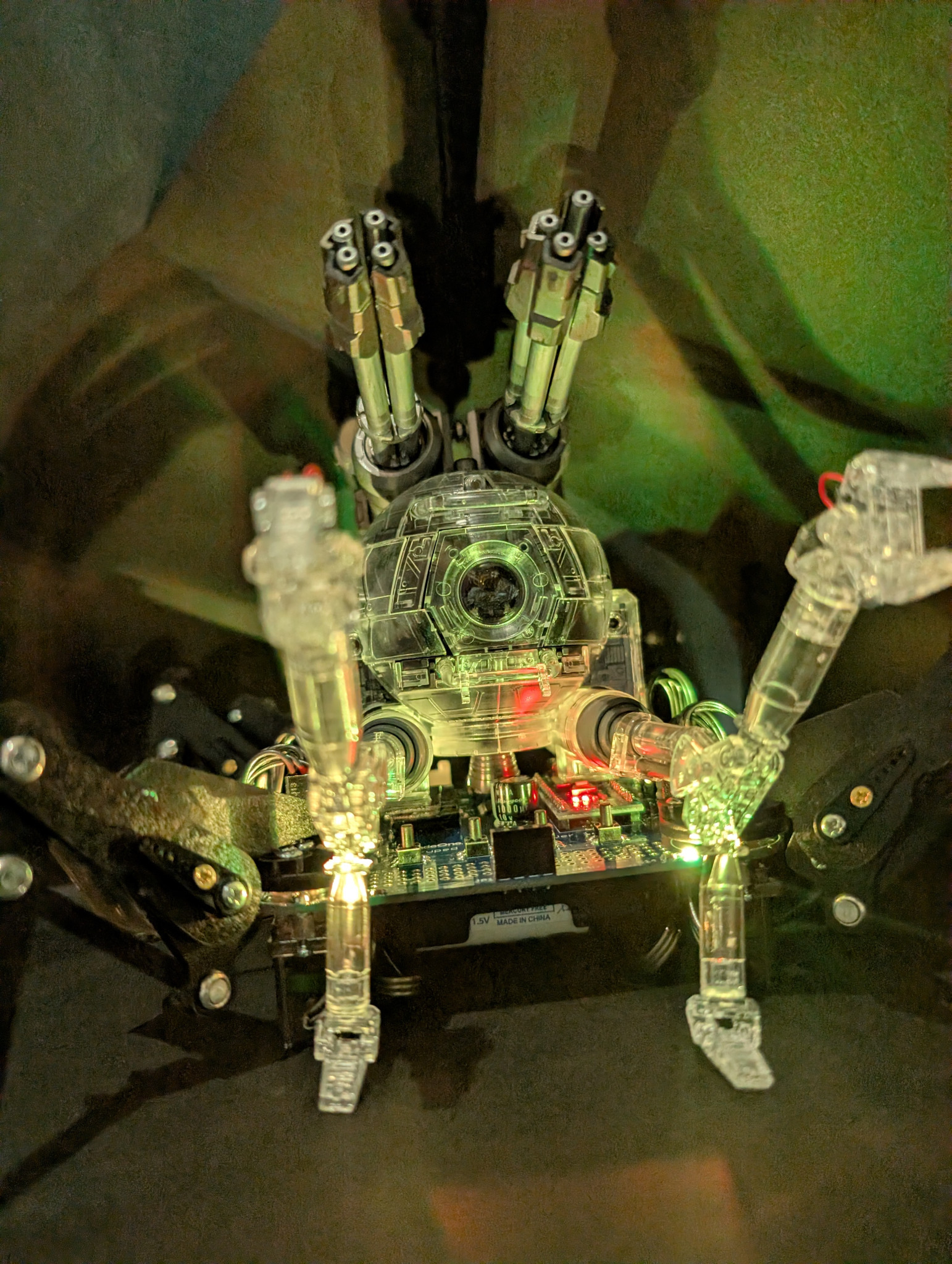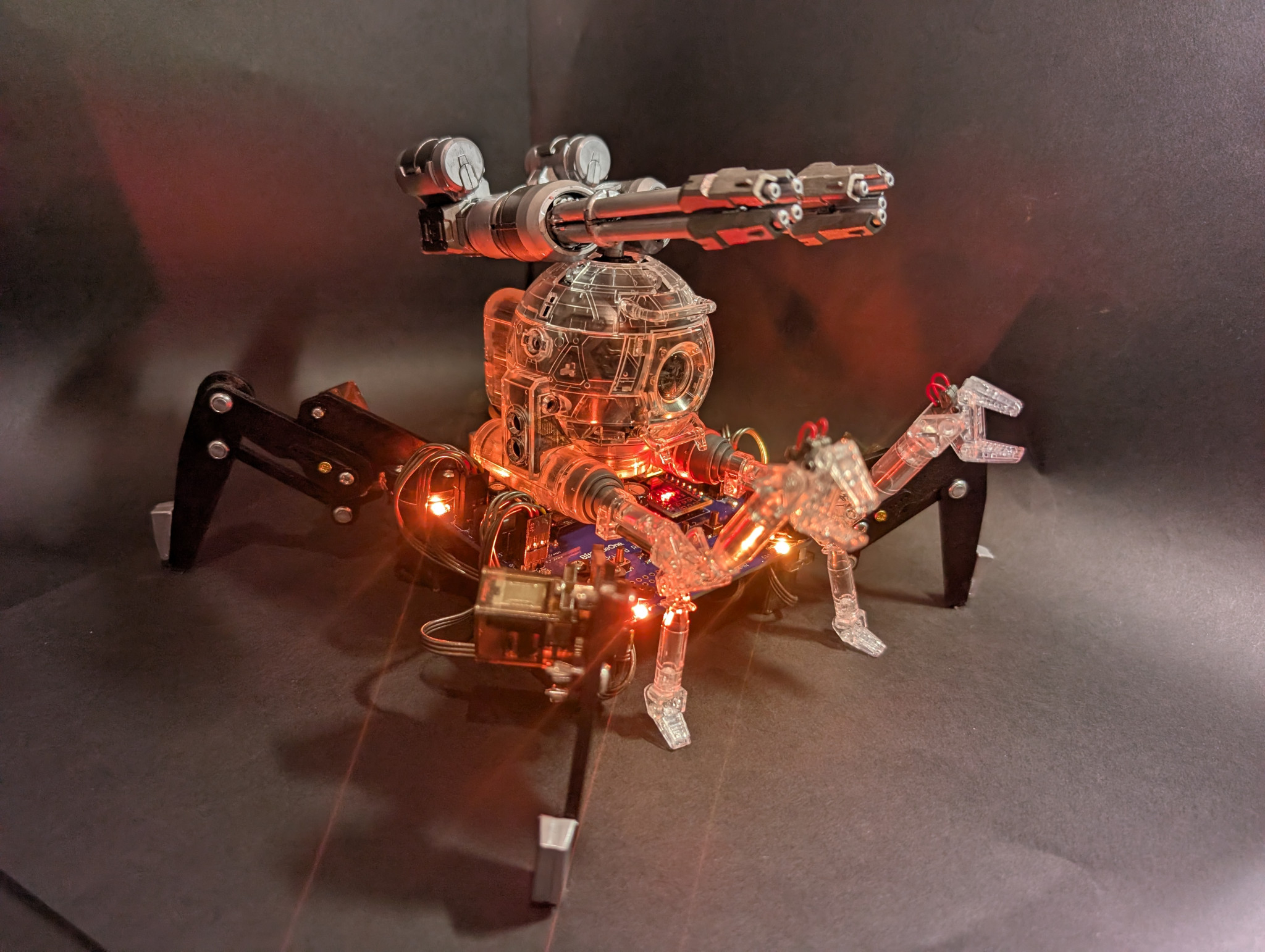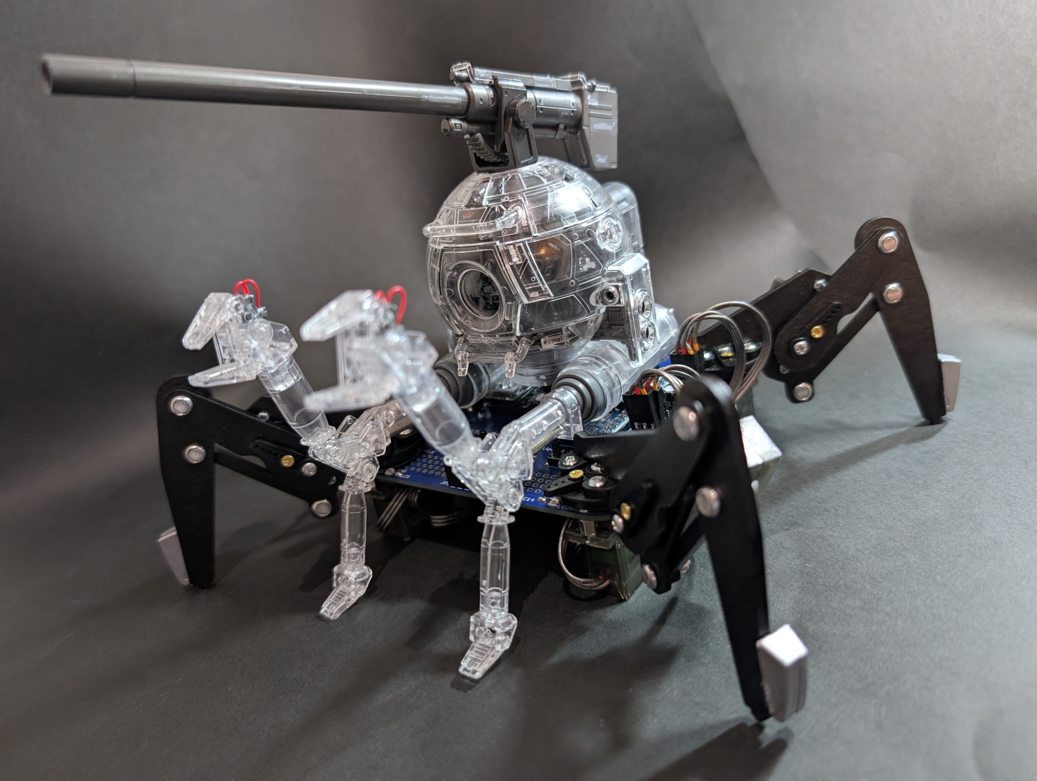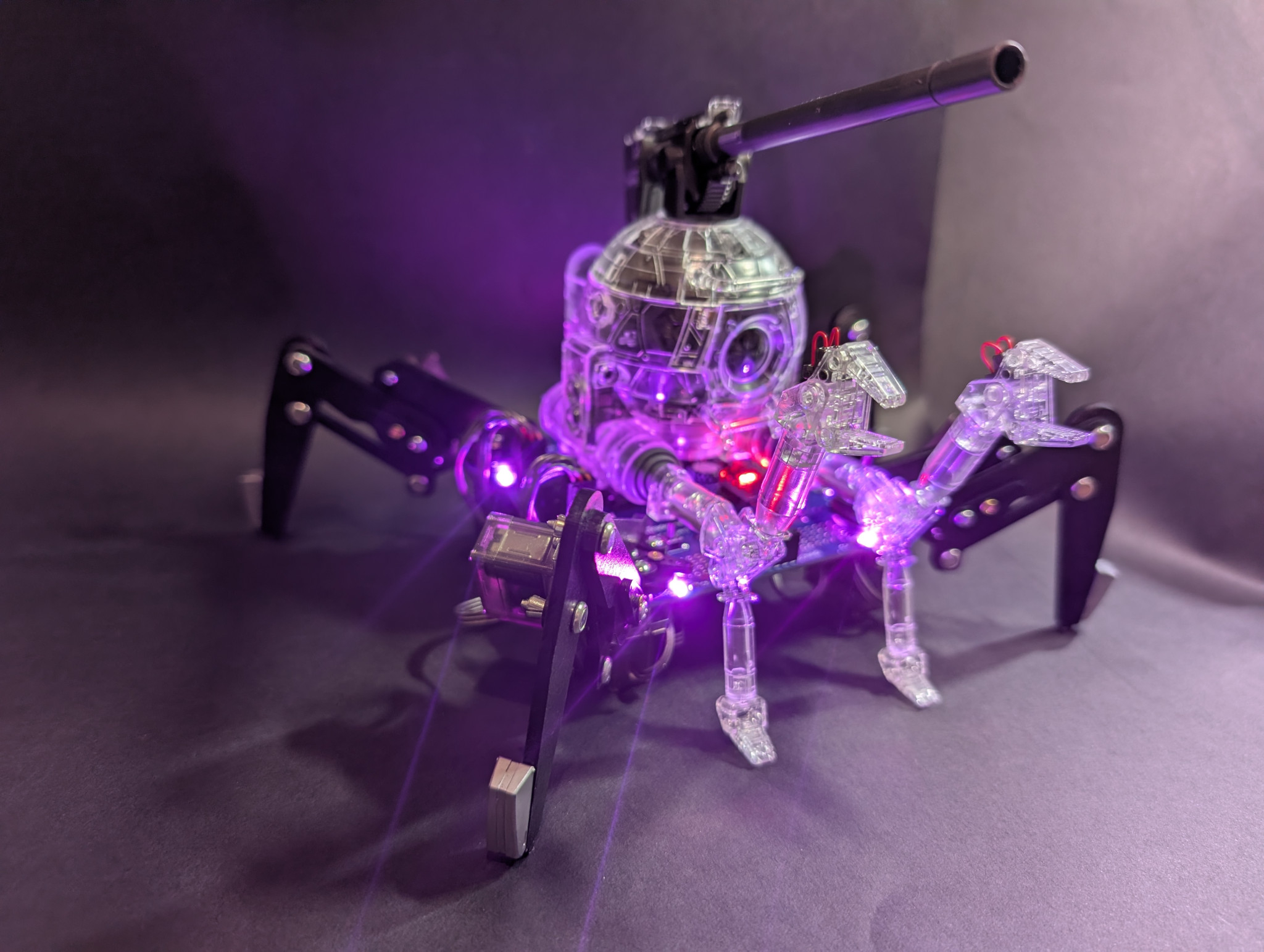 ベースのマシンはこちら。四足歩行ロボット「クアッド・クローラー」です。クモのようにカニのようにウネウネ動きます。光りながら。