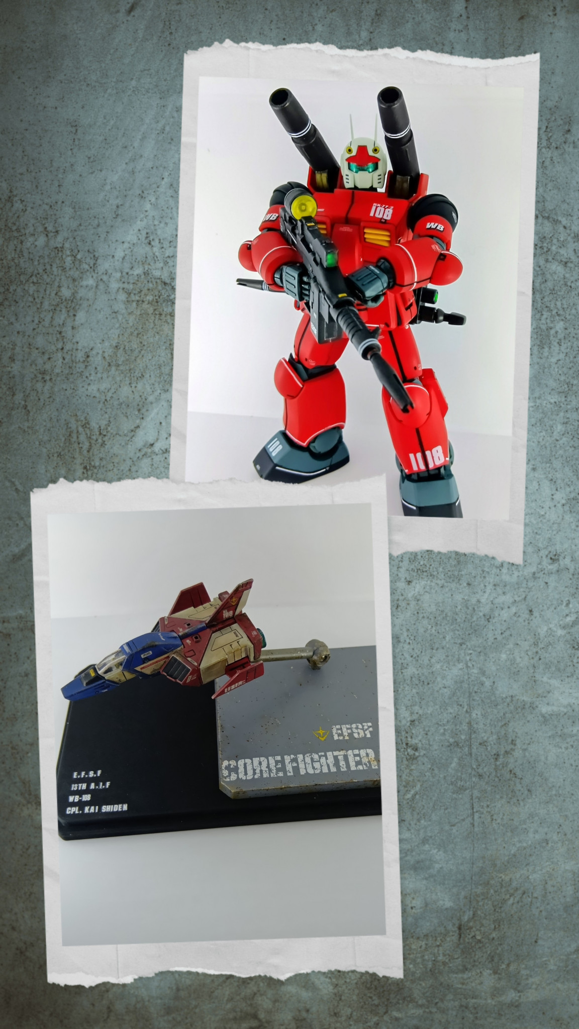 ガンキャノンには前期型のビームライフルを持たせて、ガンキャノンビームライフルは後方にマウント装備。コア・ファイターはアクションベース台座と100円均一のディスプレイケース台座に情報を記載とウェザリングを施しました。