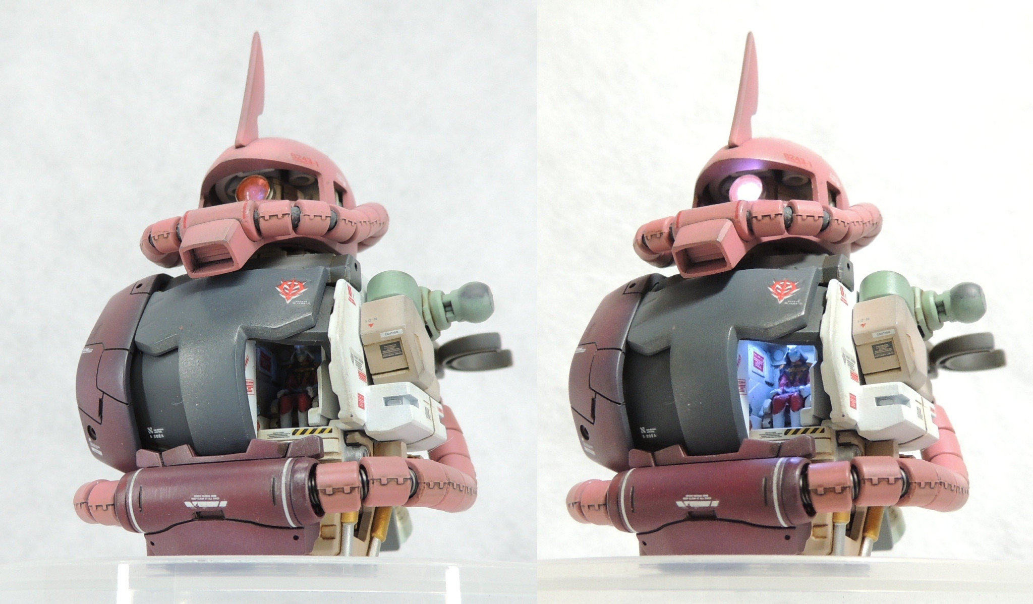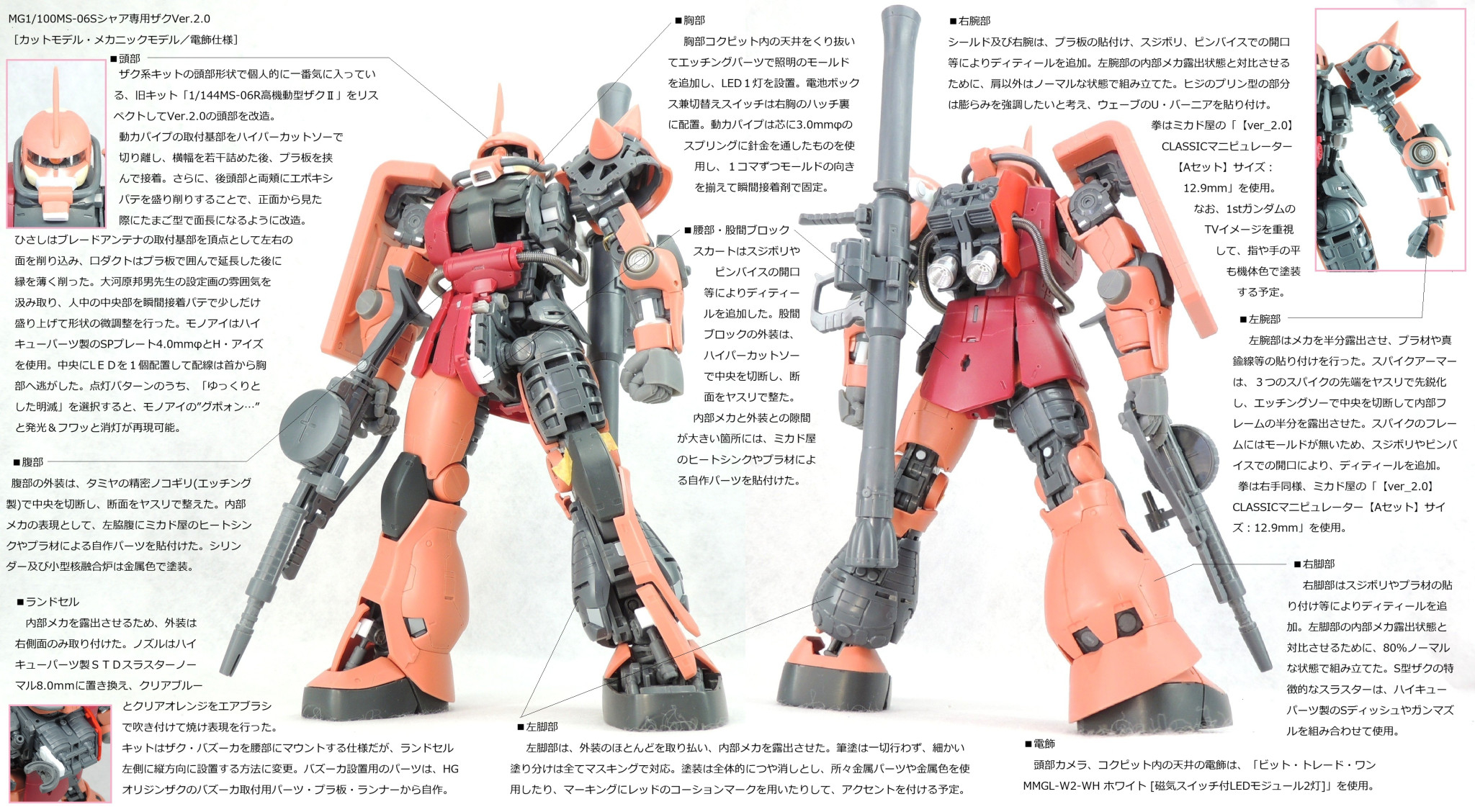 マスターグレードのシャア専用ザクに、カットモデルやメカニックモデルのテイストを盛り込み、さらに頭部とコクピットに電飾を仕込んで完成させました。
