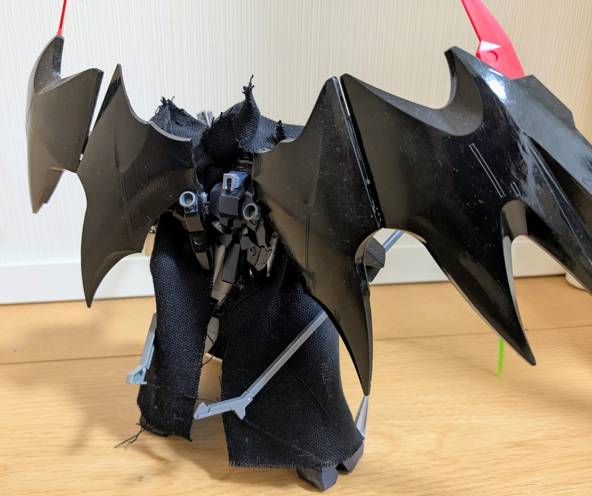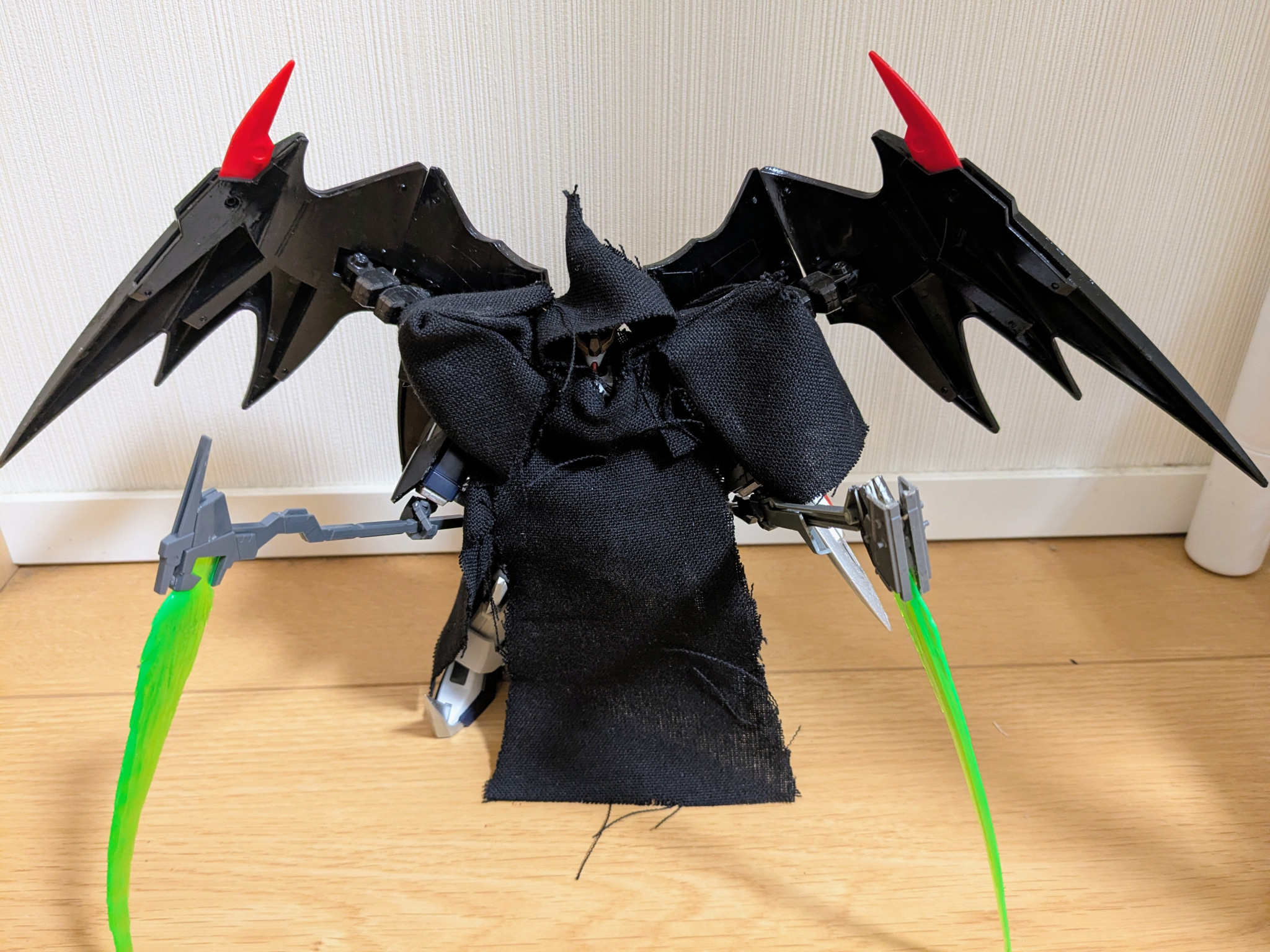デスサイズヘルのクロークドカスタムも、羽はマントの外に出ていたので、それに倣ってあります。