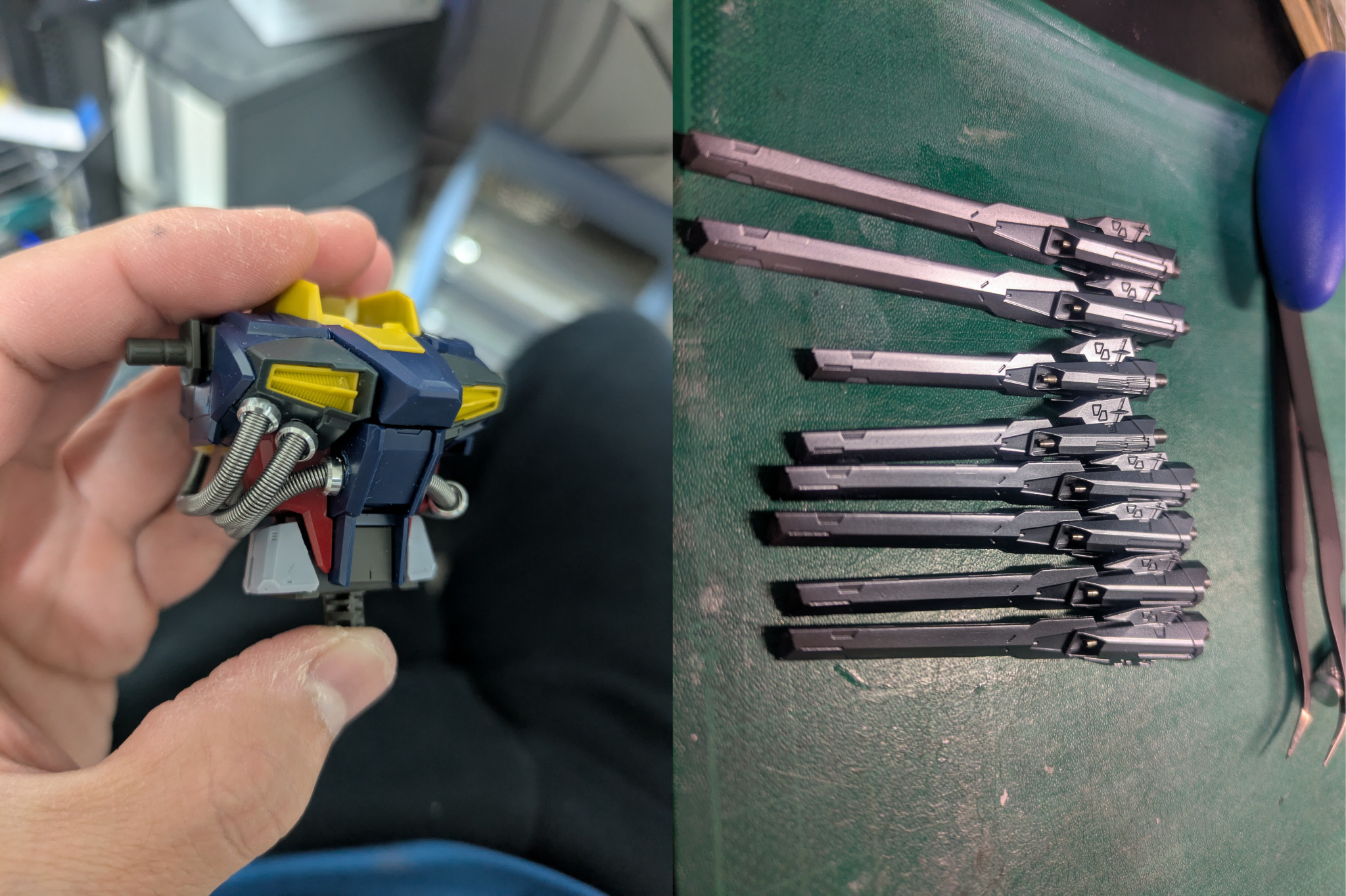 まず第一に、量子通信ケーブルのゴムパイプを何とかしたいと思い、針金+内径2mmバネでパイプを金属化しました。この写真は試作段階で、コックピット横のメタルパーツはほかのものと最終的には交換しました。