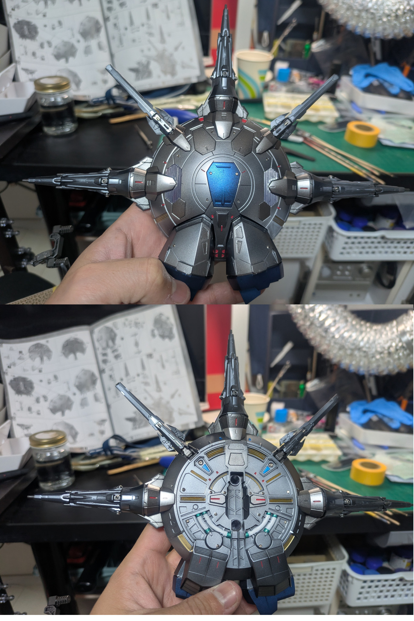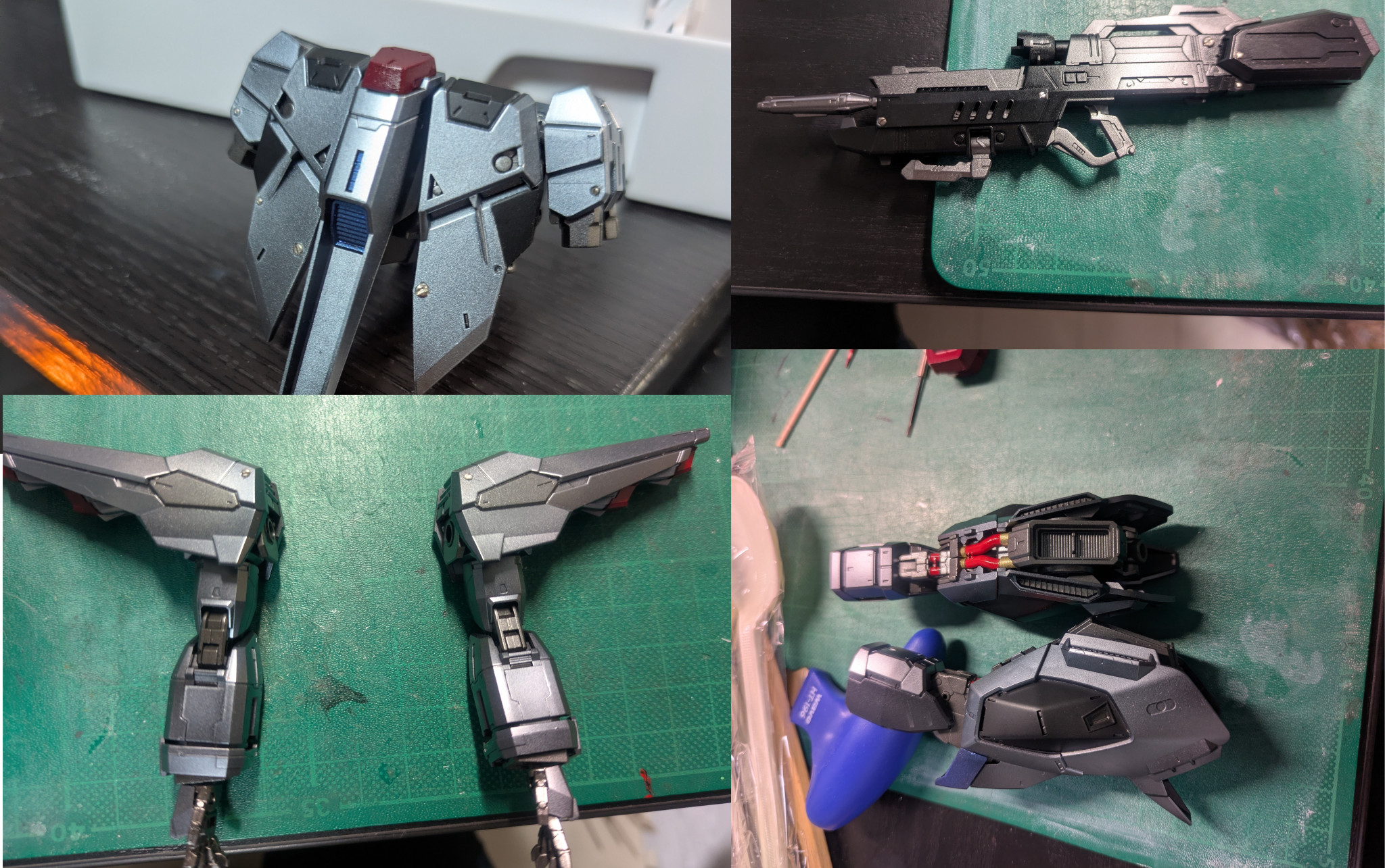 大型ドラグーンの発射口も全てメタルビーズを使って金属化。丸モールドはメタルマイナスモールドに。エアブラシと筆塗りで塗分け。背中と合う部分は細かいので筆塗りメイン、背面はマスキングをして複数のメタリック系で塗分けました。複数のパネルで構成する感じが出せたと思います。写っていませんが、バーニアはチタン焼けを表現するようにクリアカラー青、赤、緑、黄を使っています。