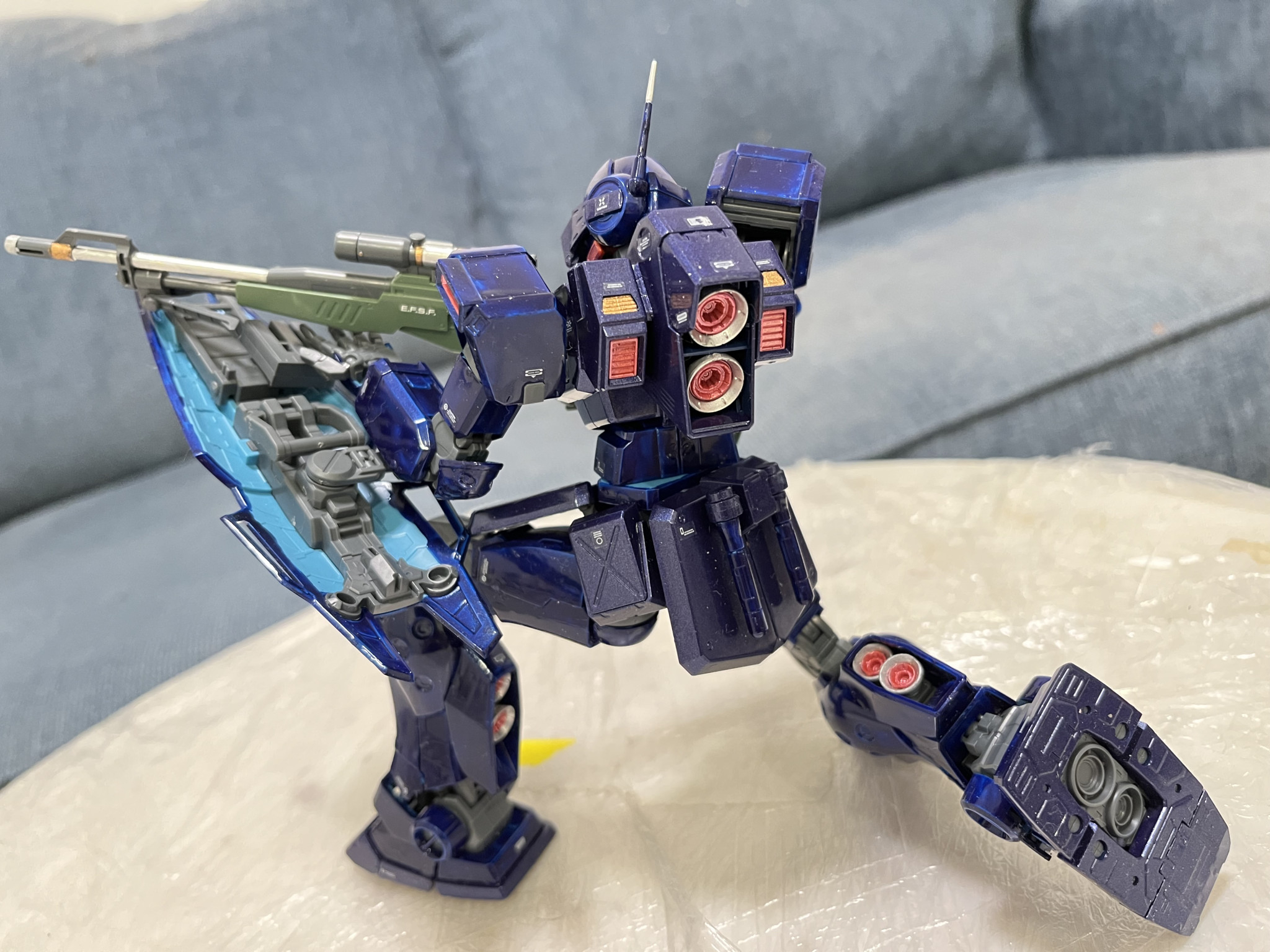 「やられる役」のイメージを変えるため、ティターンズ仕様にました。二度と同じの調色ができないので、胴体や足は前作のブリッツガンダムの紫に光沢白を加えたものです。青はタミヤのLP-47のPearl Blueです。