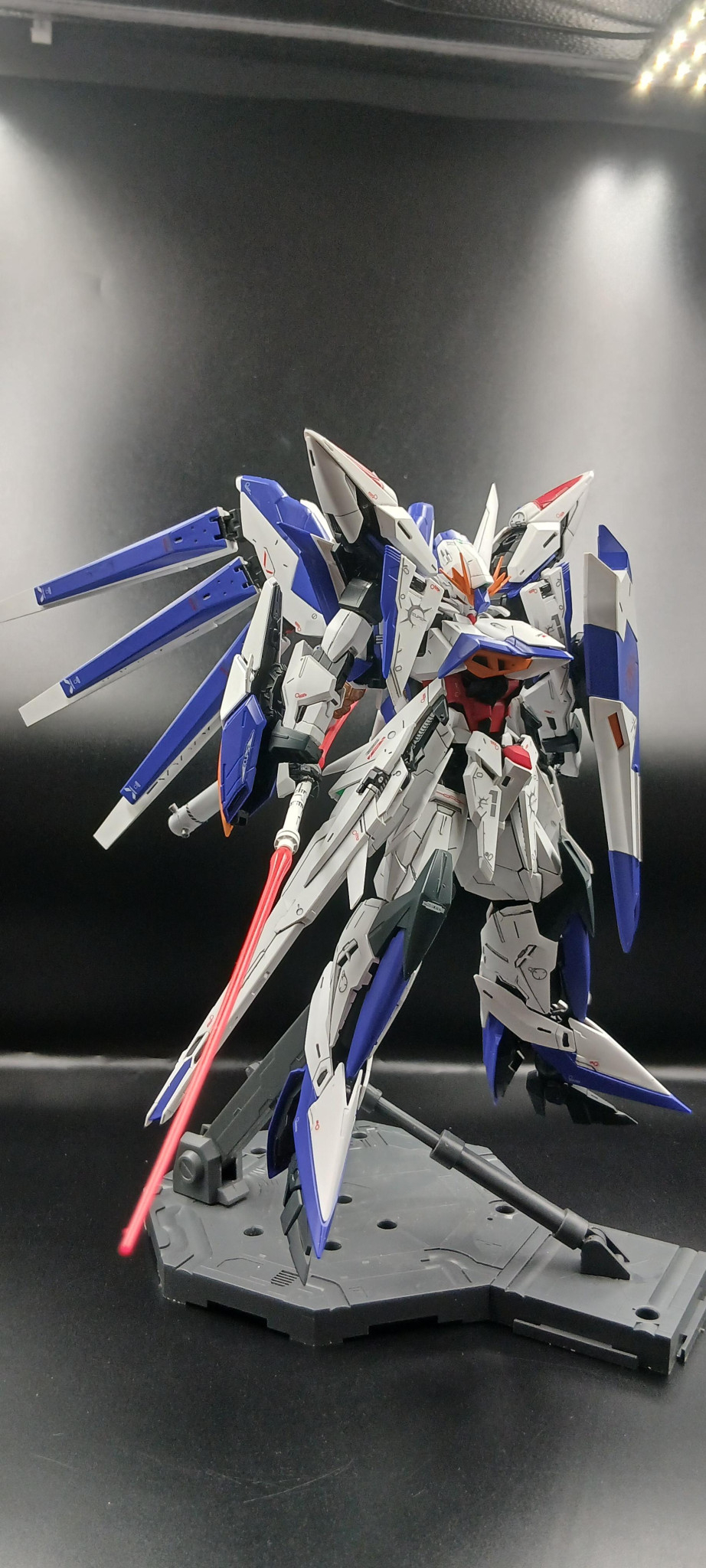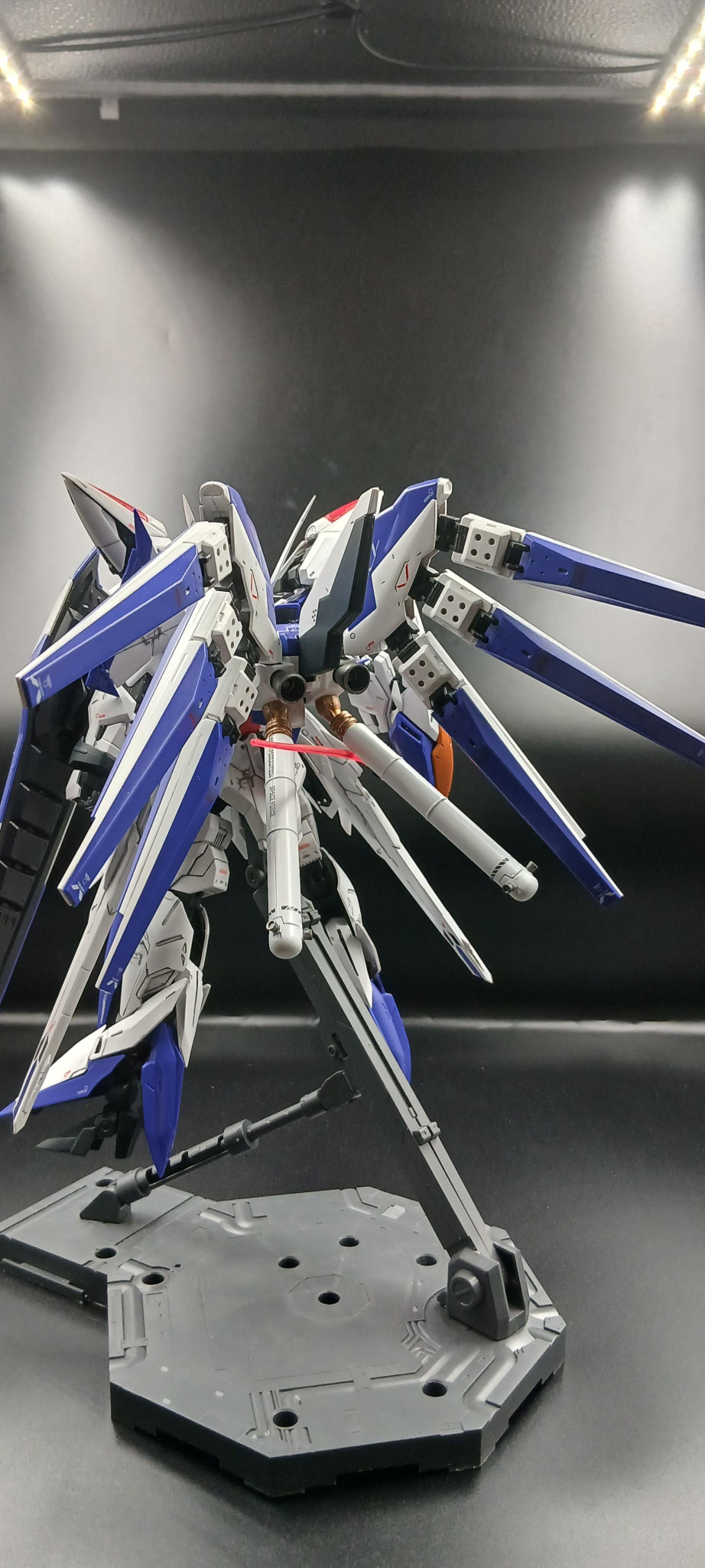 前面のボリュームに負けないHi-νのファンネルの装着、全体のシャープさに絶妙なアクセントを与える盾。これは凛々しさと美しさが伴う半端ない作品ですね😆実に格好いいです👍
