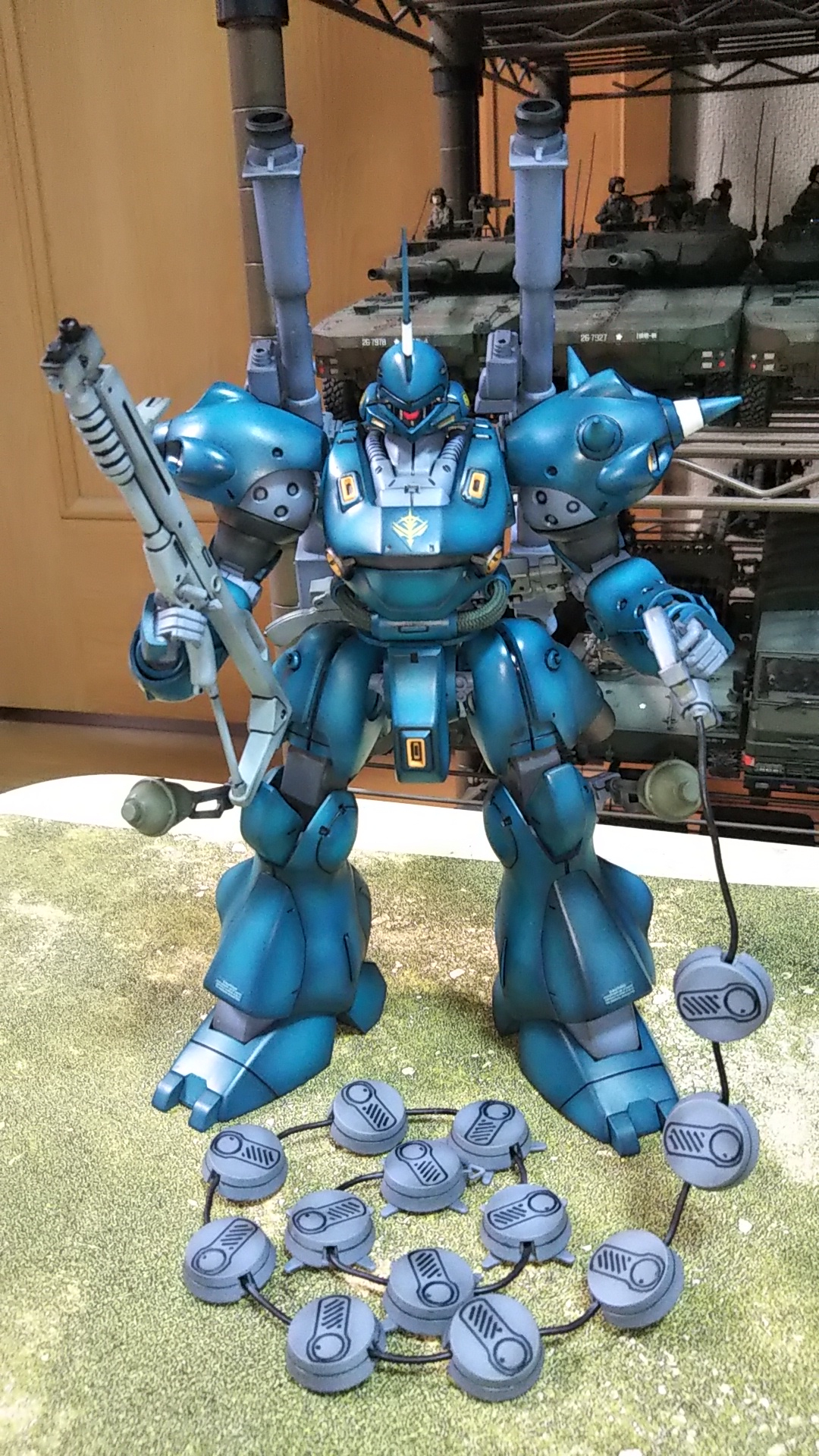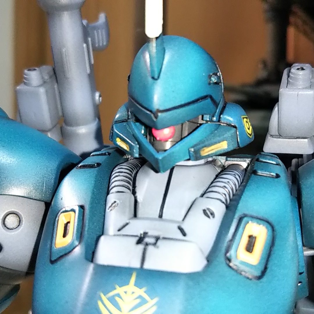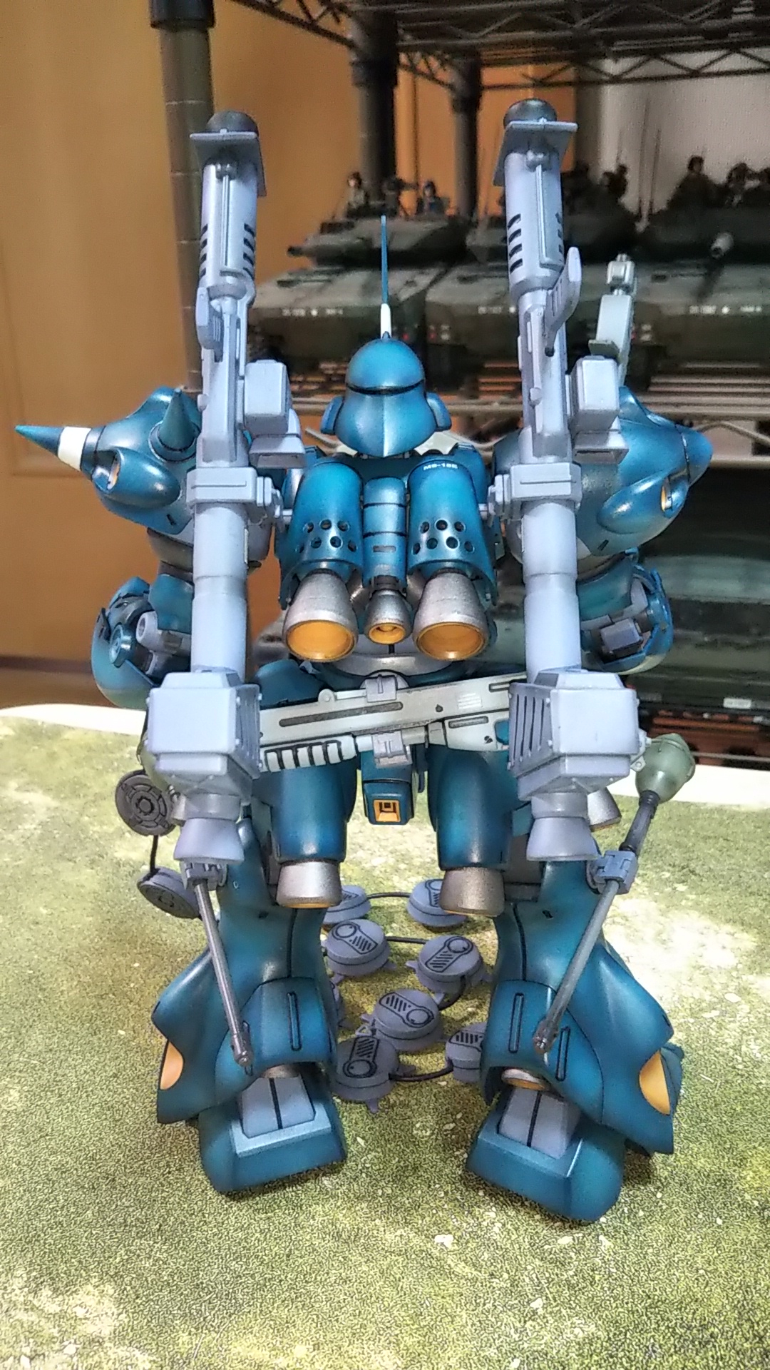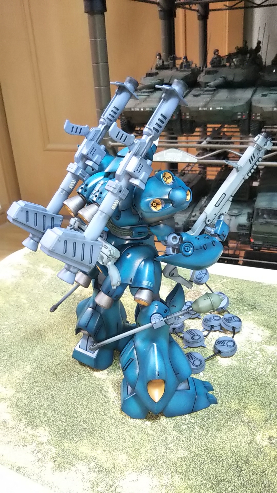 渋めの蒼いボディに武装は薄めのグレーが使い込まれた雰囲気出ていてカッコイイです(zaku-kao6)!