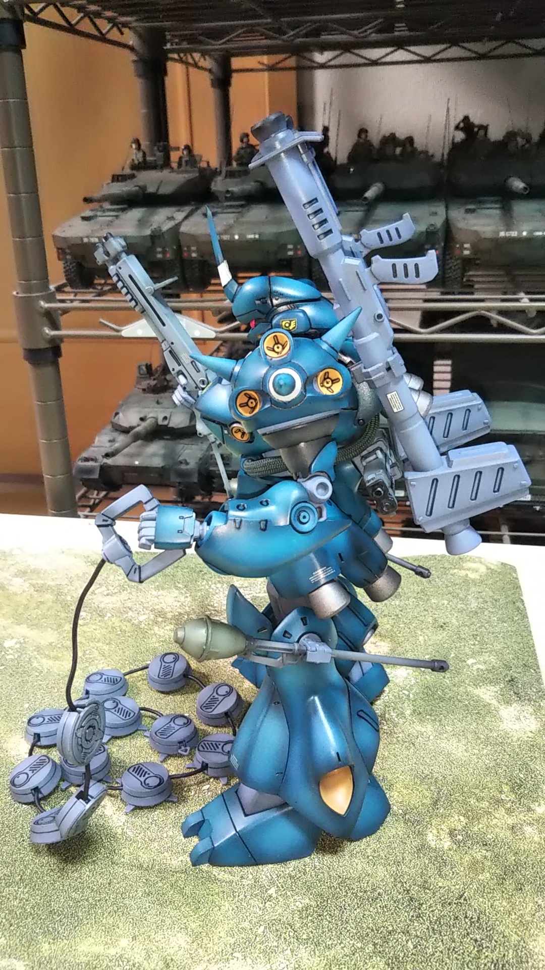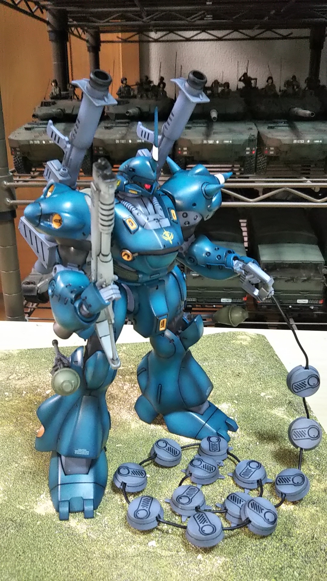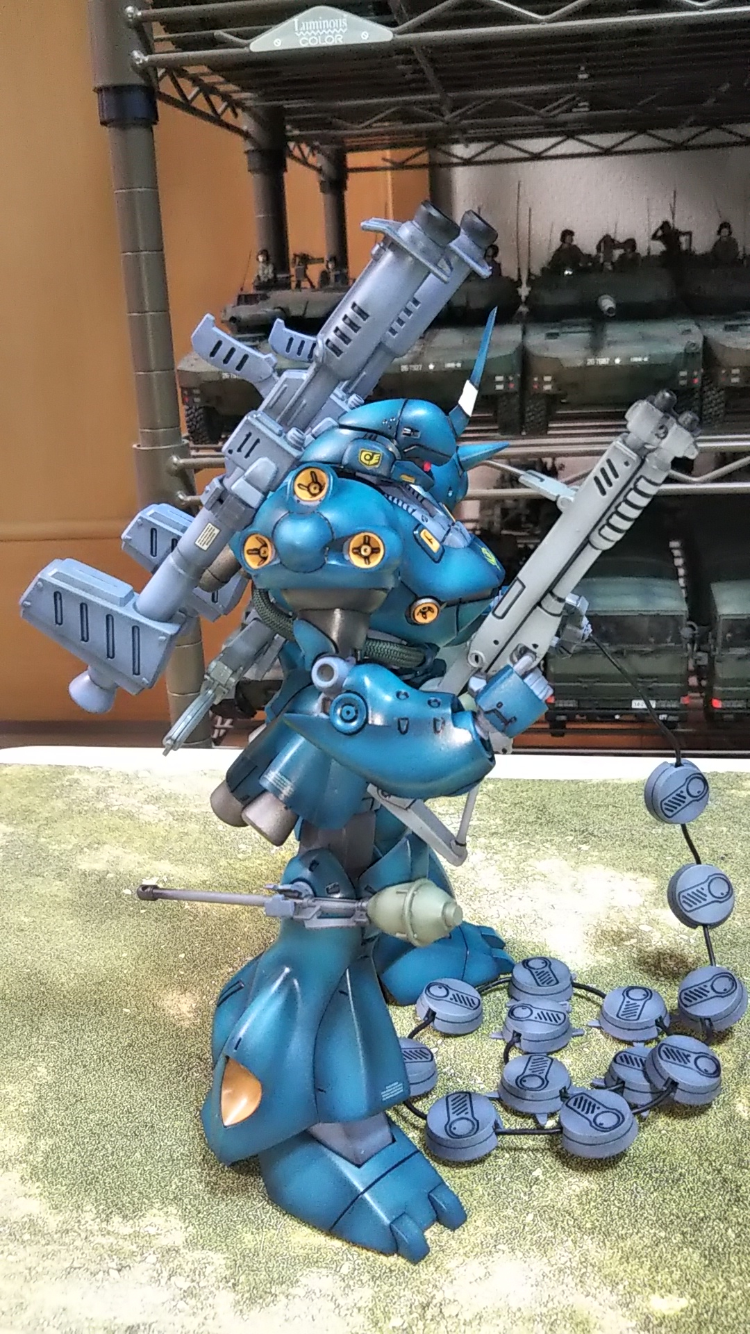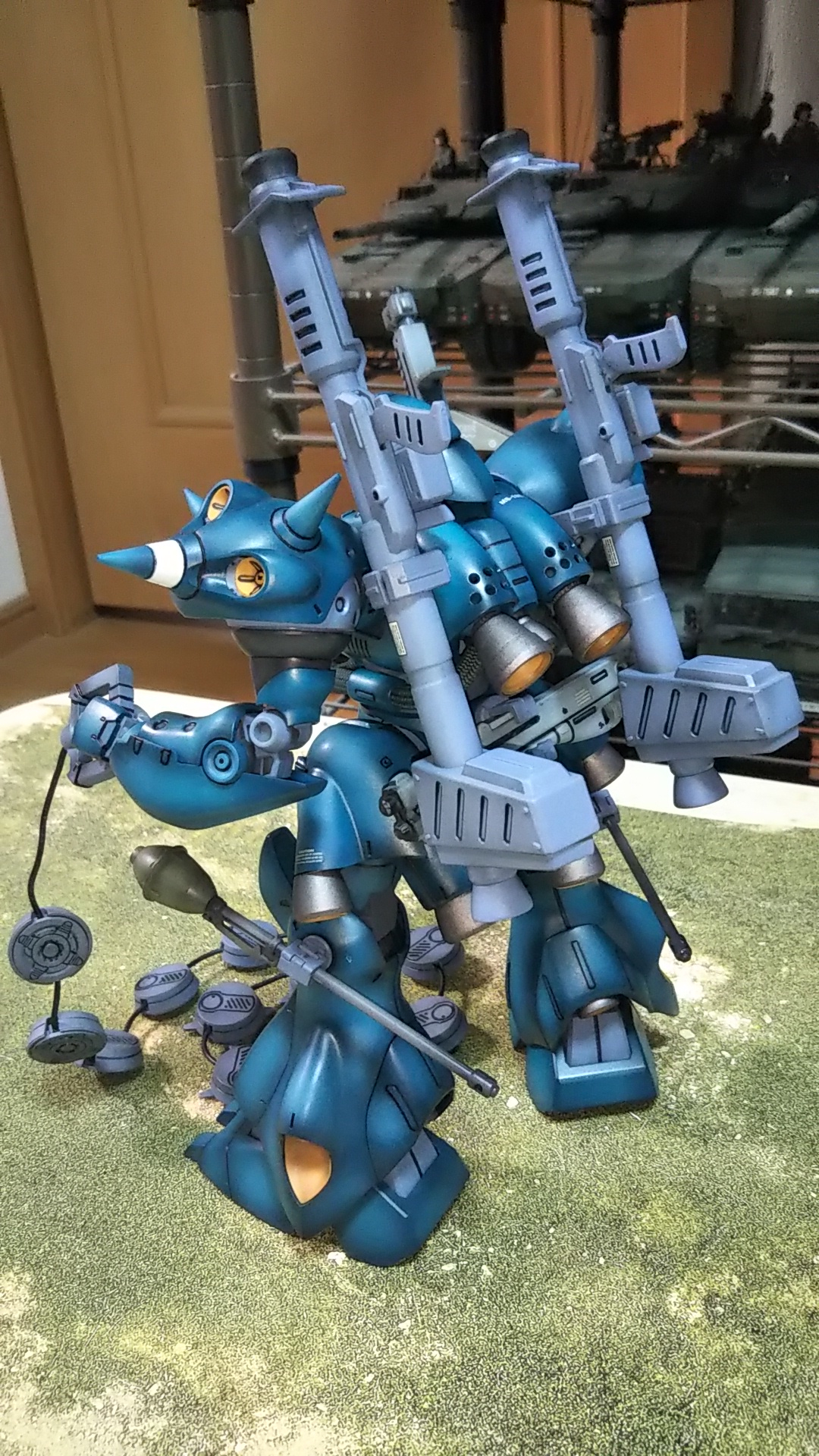 渋めの蒼いボディに武装は薄めのグレーが使い込まれた雰囲気出ていてカッコイイです(zaku-kao6)!