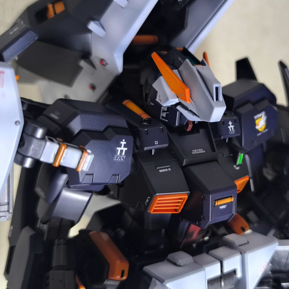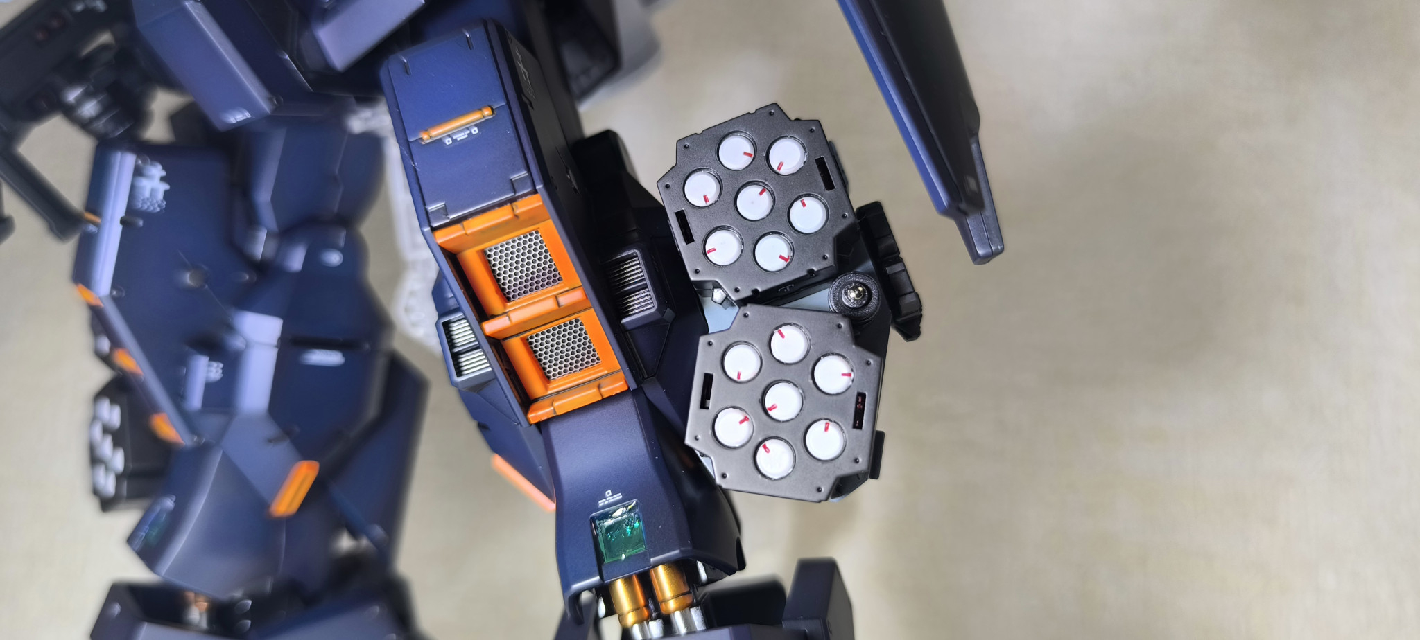 特徴的な脚部のスラスター?の黒い穴はくり抜いて金属メッシュを貼りました。