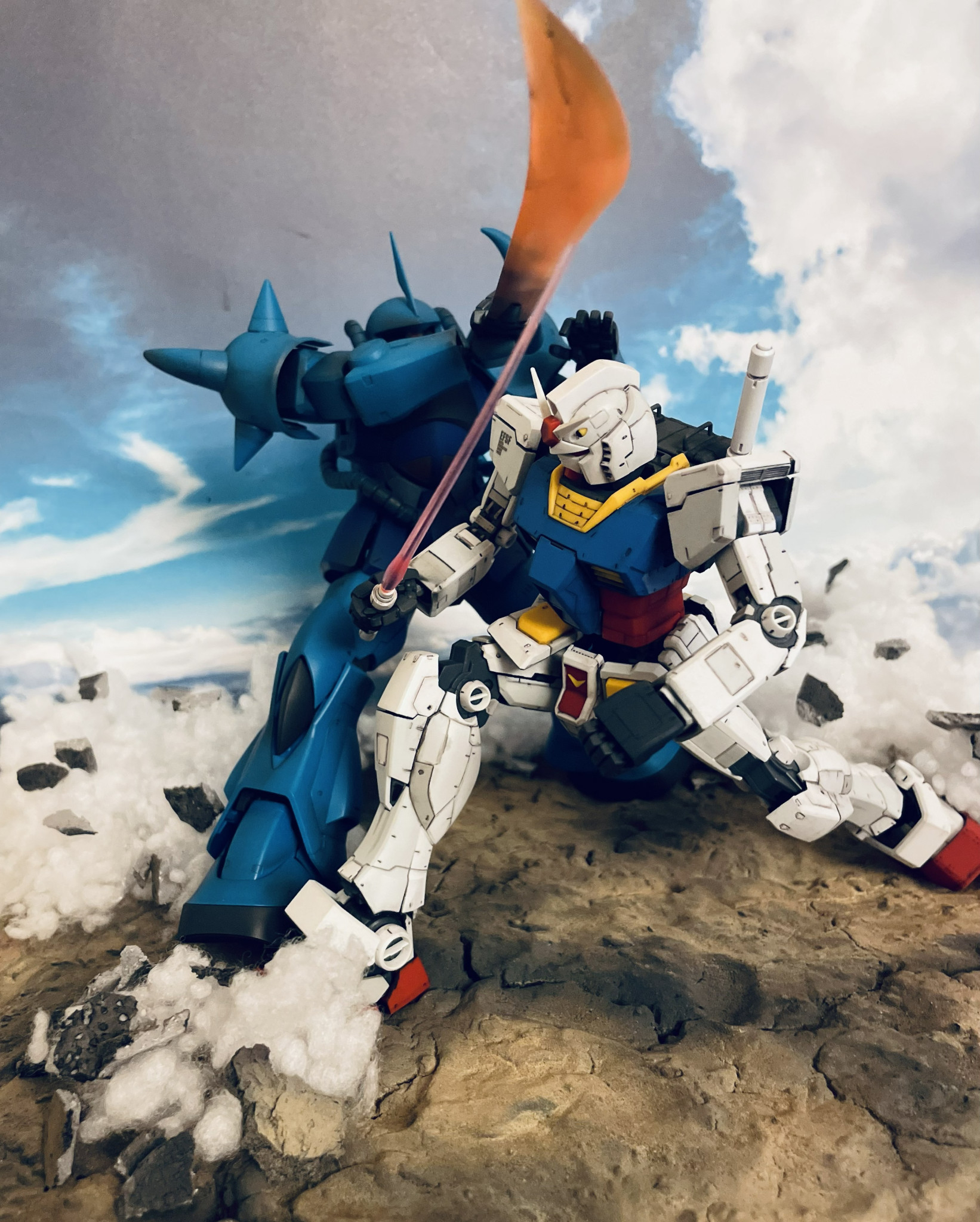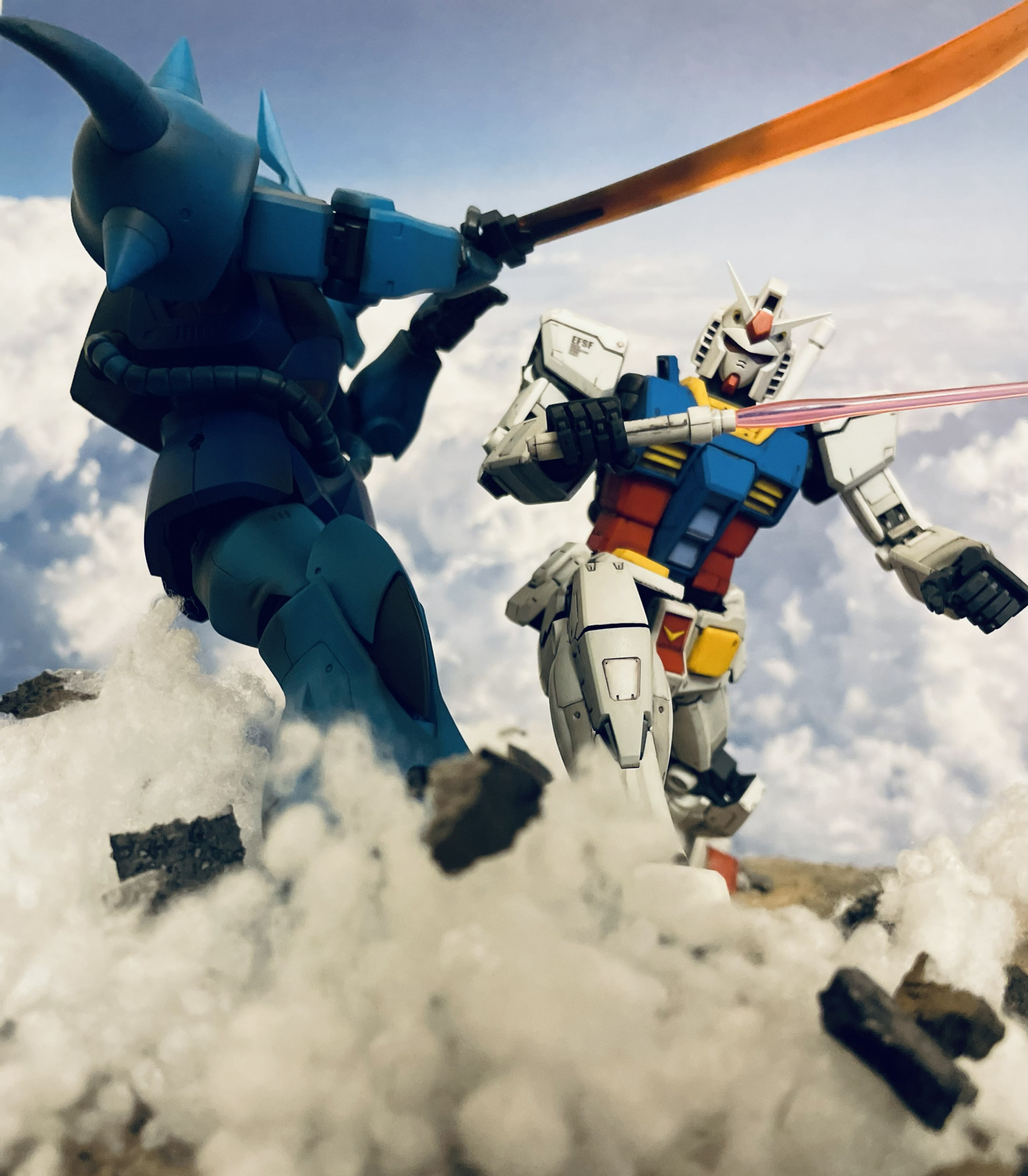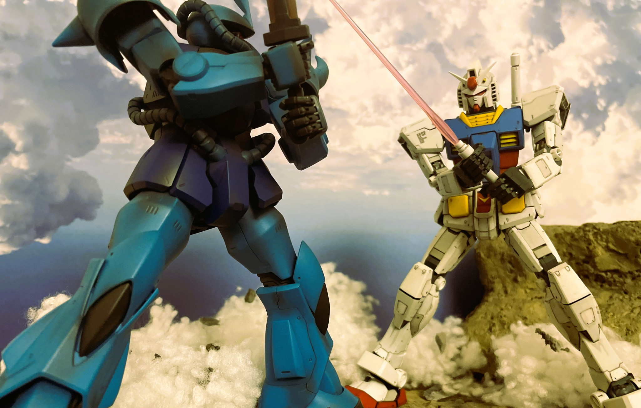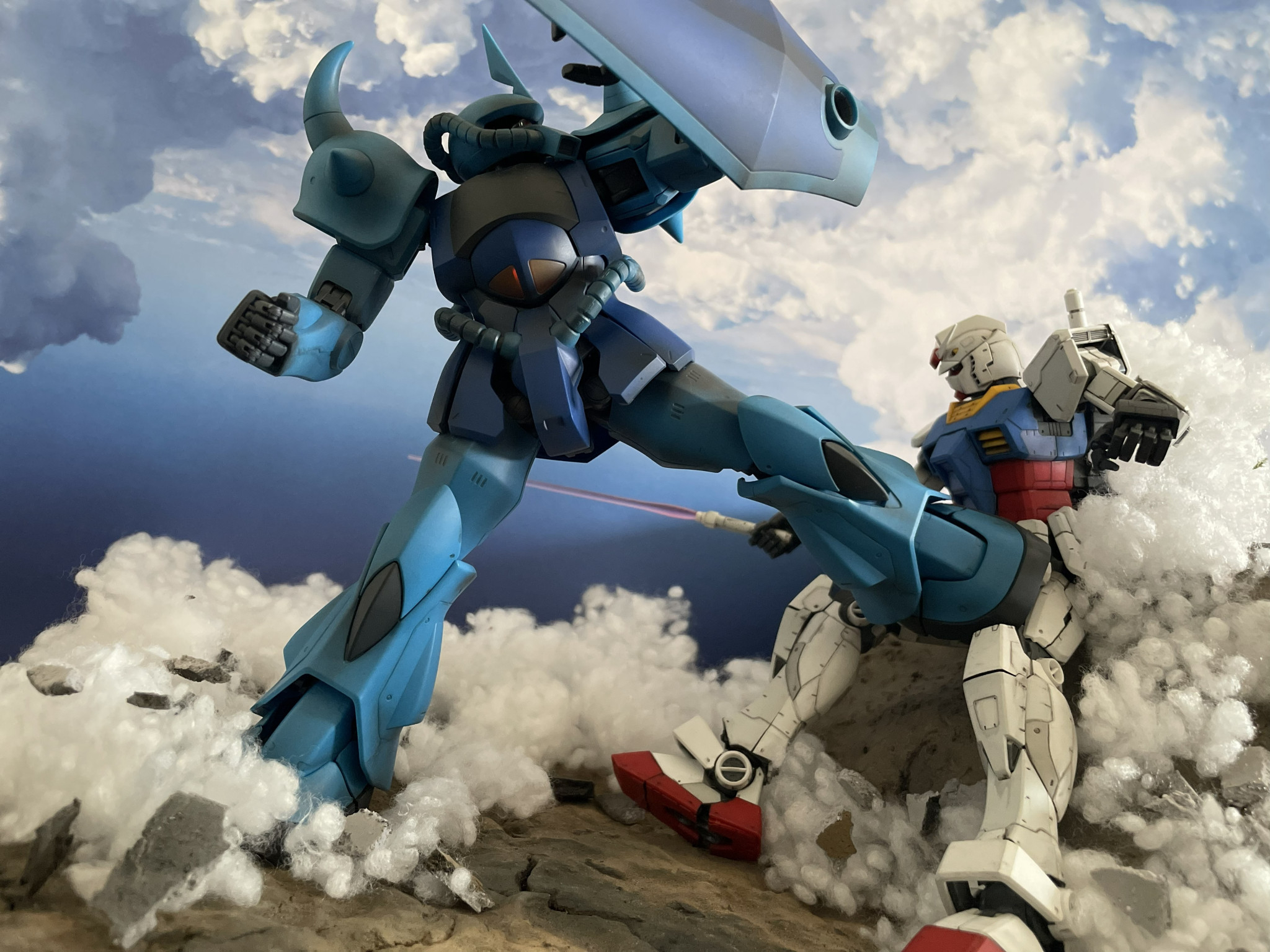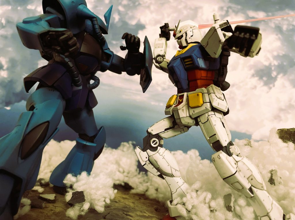 ランバ・ラル特攻より、あの名シーンの再現を試みました。ガンダムはMG version 3.0、グフはMG version 2.0を使用しています。