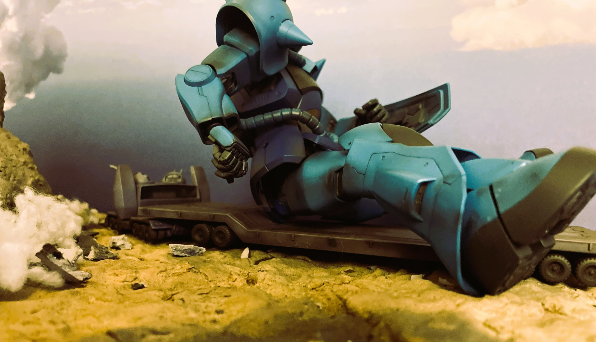 サムソン・トレーラーから起き上がるグフです。サムソン・トレーラーはEXモデルとなります。購入から大分月日が経ちましたがついに日の目をみました。