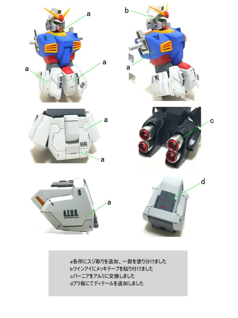 ガンダムマークII2.0にスジ彫りやプラ板にてディテールを各所に 追加しました。バーニアはアルミのもに交換しました。 今回は付属のディスプレイ台を製作してみました。