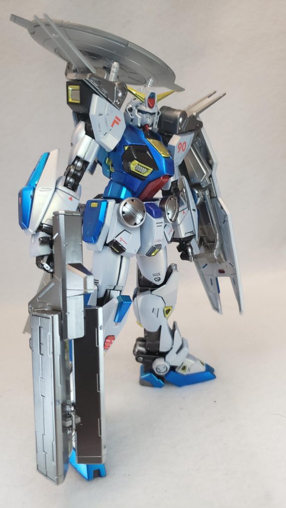 ガンダムF90は性能検証用のワンメークモデルMSとして位置付けられる[4]。検証実験をしていき改良を加え、量産化していく流れの大元になったほか、F91の前型機となった[4]。F90の採用によってアナハイム社の独占は崩れたが、連邦軍上層部は実績のないサナリィの機体を量産する事は尚早と判断。データ収集と評価試験の継続が行われた。2機が製造され、うち第13実験戦闘団に配備された機体は火星での実戦データをもたらした[3]。意図的にRX-78-2 ガンダムに似せられている。