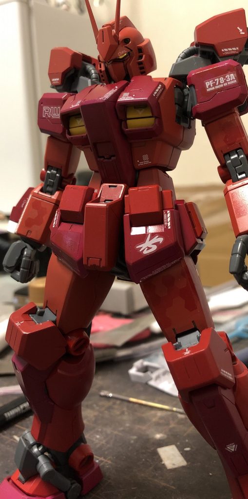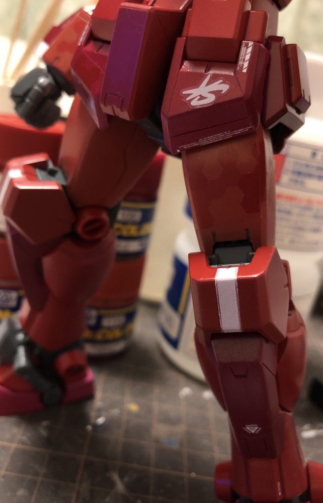 赤色4色追加しながらデカール貼り。微妙にわかりずらいですがモモ、ヒザ、スネ、ふくらはぎと色別になっています