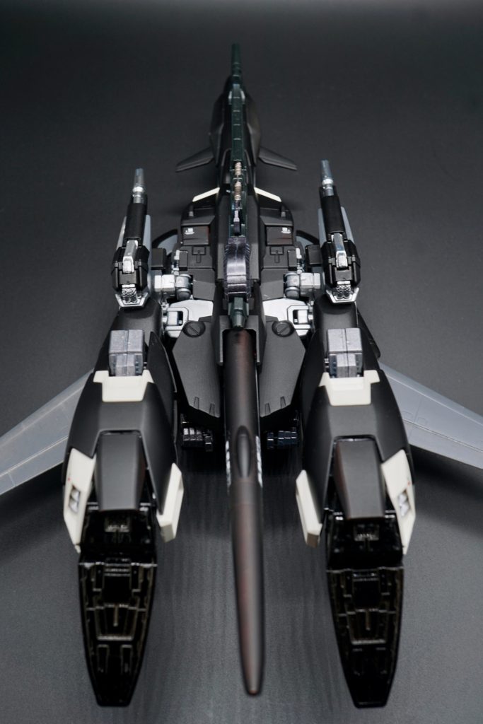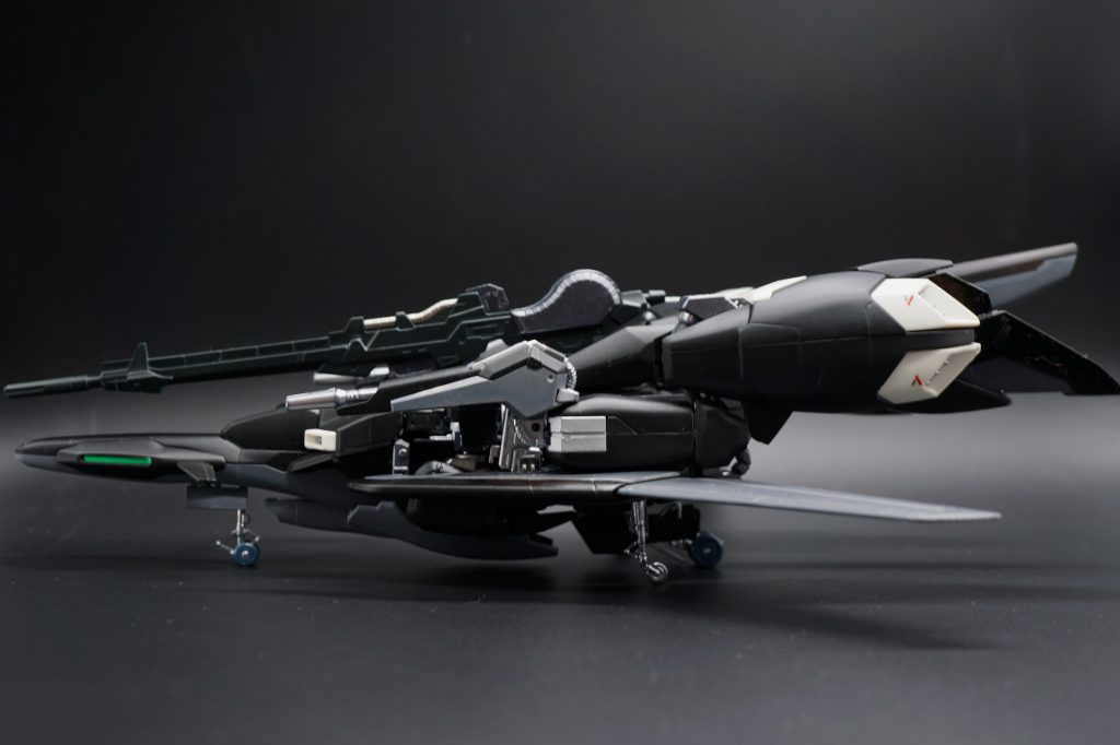 当初はグレーのUCカラーに塗装していたものの、もしかしたら黒に塗ったらカッコ良いんじゃね?という事で急遽ボディーカラーを黒に変更。全身まっ黒の隠密可変MSにしようかと思っていたところ、まっ黒だと面白みに欠ける(!?)かもと思い羽をグレーに。結果こんな感じのステルス仕様に仕上がりました。