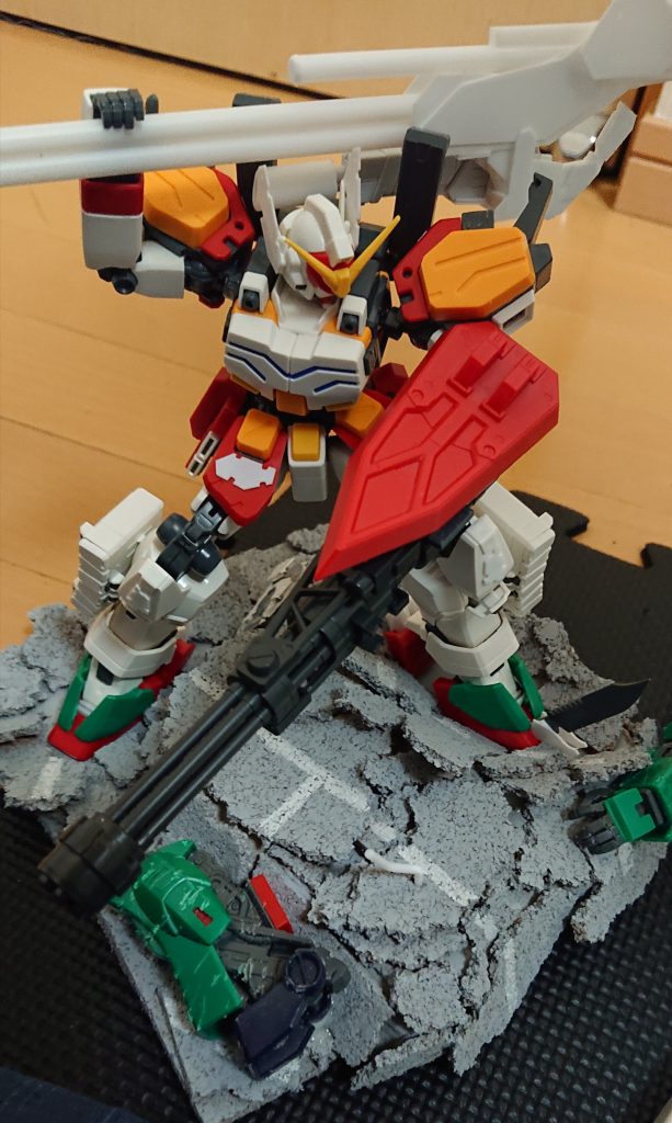 ポージングは色々迷いましたが暇潰しにみていたマジンカイザーSKLが劇中で見せる「武器を担いで膝に寄りかかる」ポーズに惚れ込みベースもそれに併せて高さに差をつけたりしました。