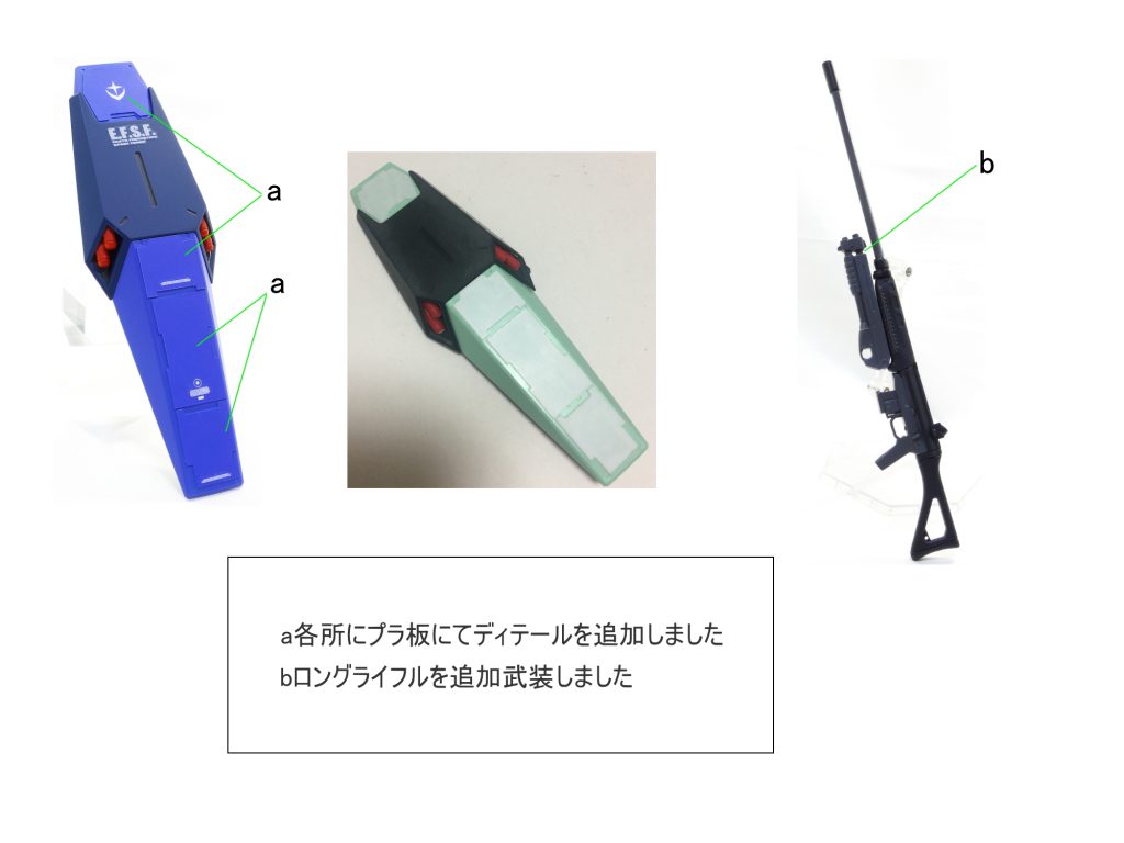MG ジェガンをユウ・カジマ機として製作しました。 全体的にプラ板を使用したディテールを追加しました。 バーニア内部にはメタルパーツを埋め込みました。 追加の武装としてロングライフルを製作しました。
