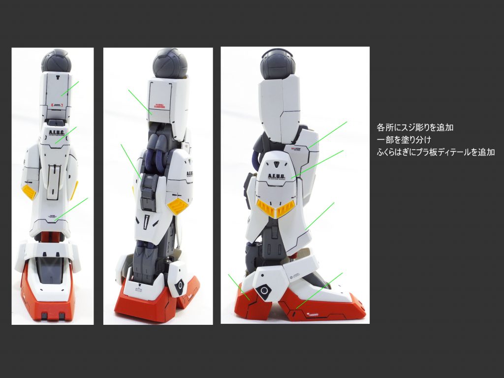 各所にスジボリにて情報量を追加して塗分け 太ももをパテにて幅…