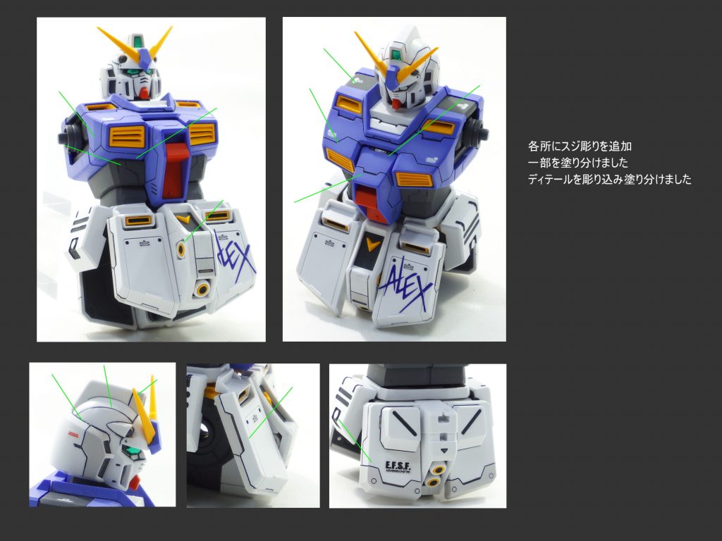 MG ガンダム NT-1 アレックス ver.2.0を製作しました。 全体にスジ彫りやディテールの彫り込みを行い 一部のディテールは別色にて塗りわけて仕上げました。