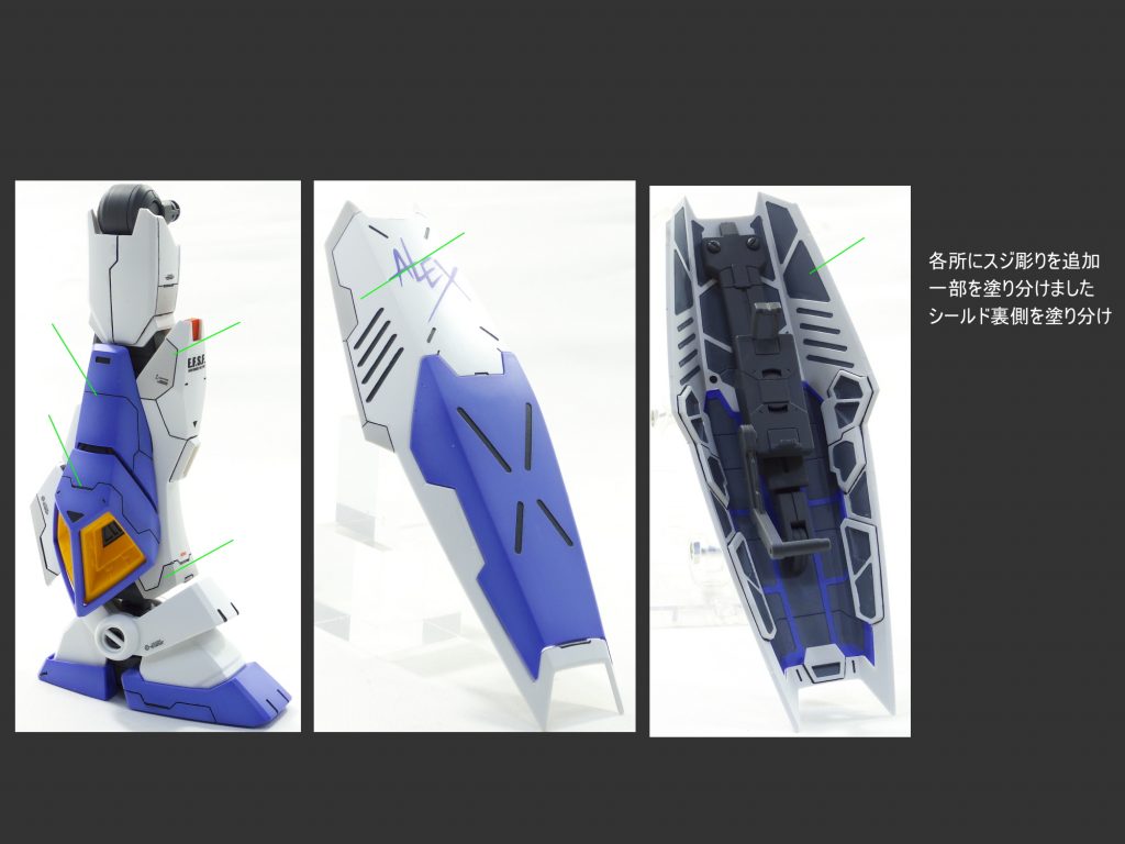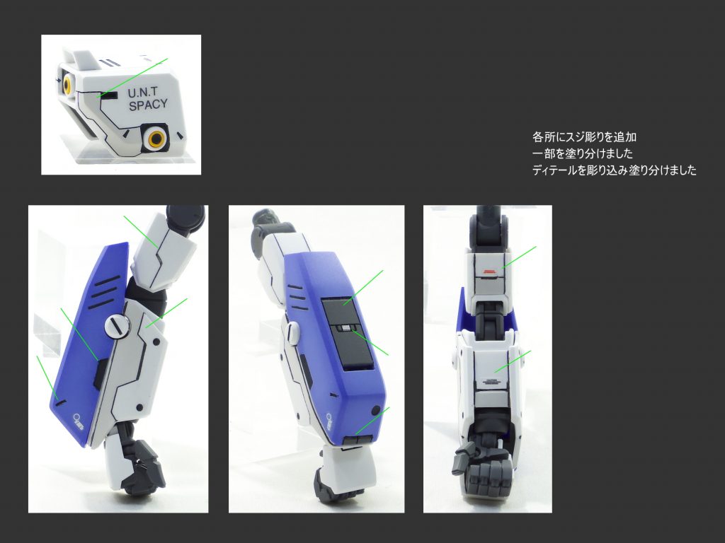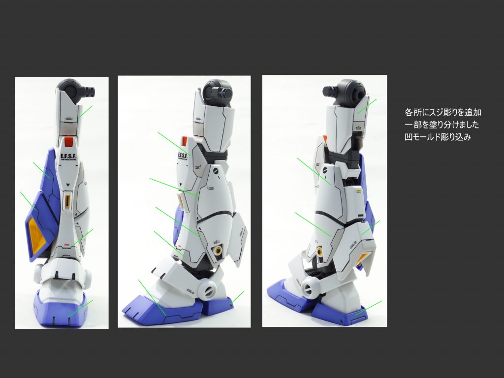 各所にスジボリにて情報量を追加して塗分け 太ももをパテにて幅…