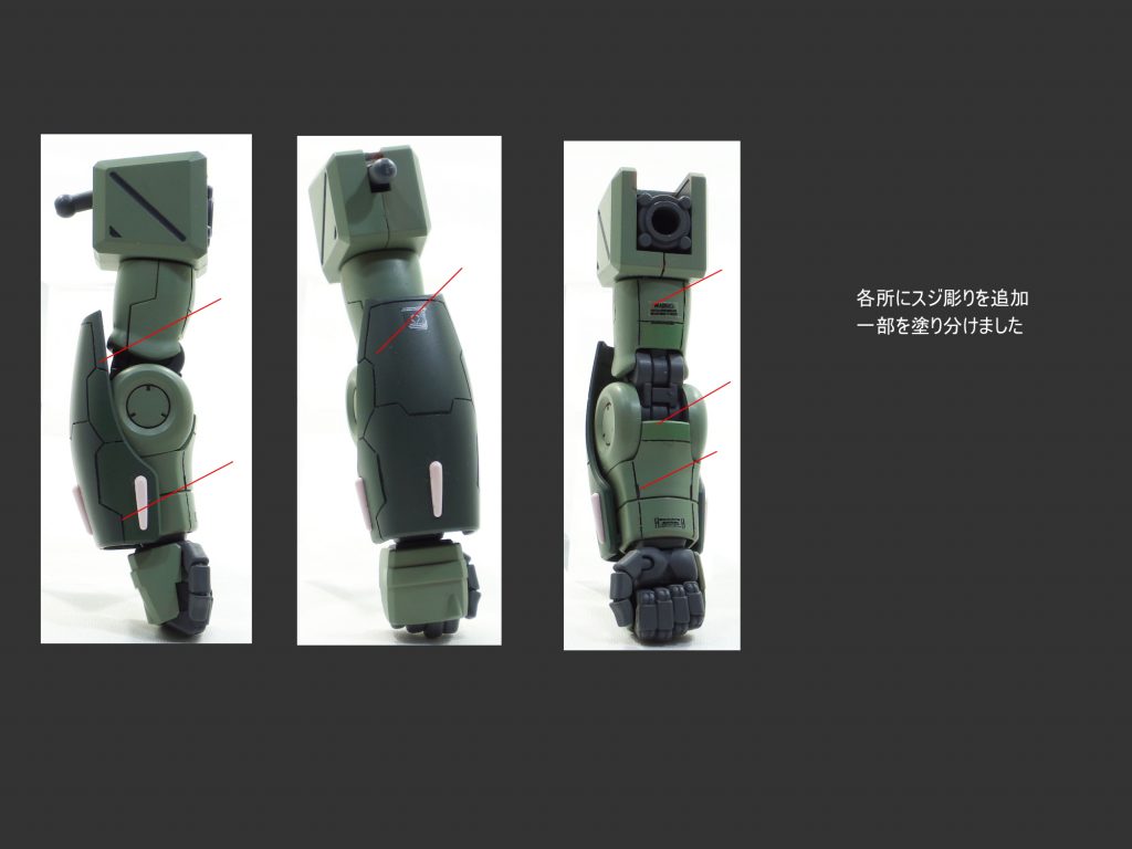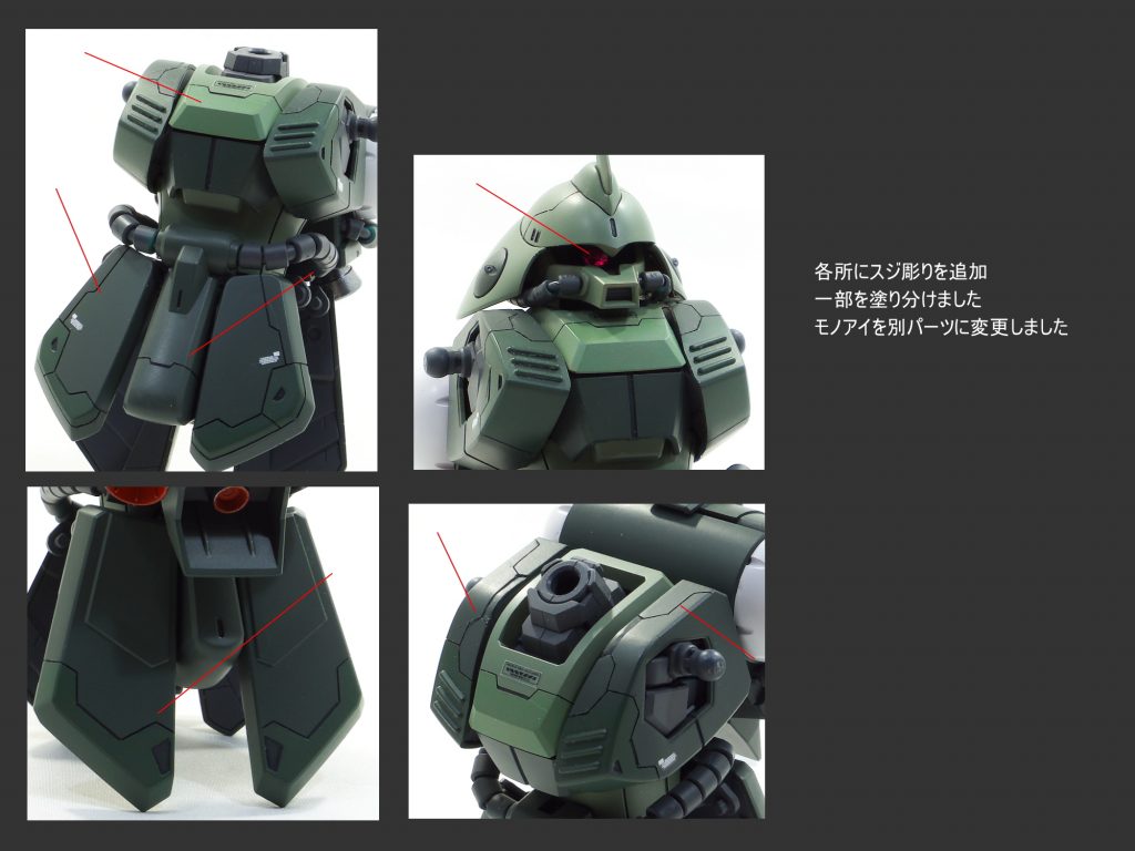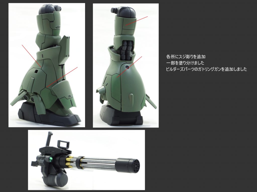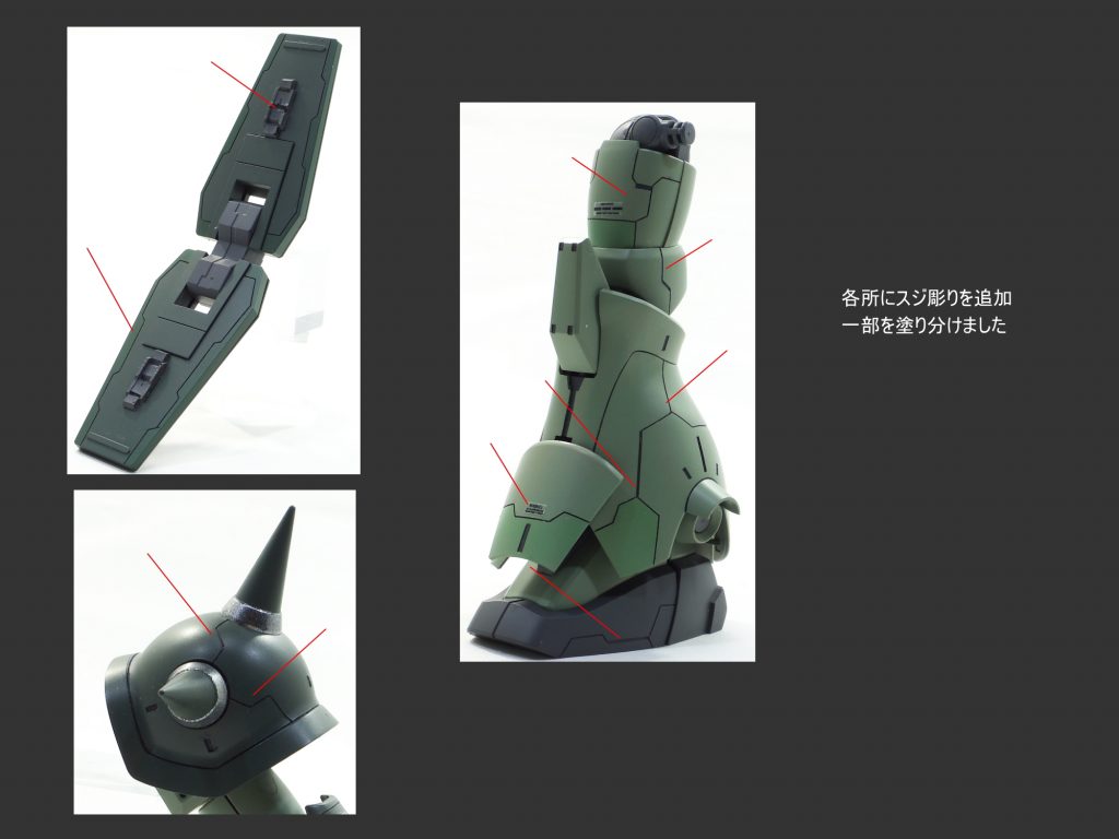 MG マラサイの本体各所にスジ彫りやディテールの彫り込みを行いました。 一部の箇所を別色にて塗り分けて仕上げました。