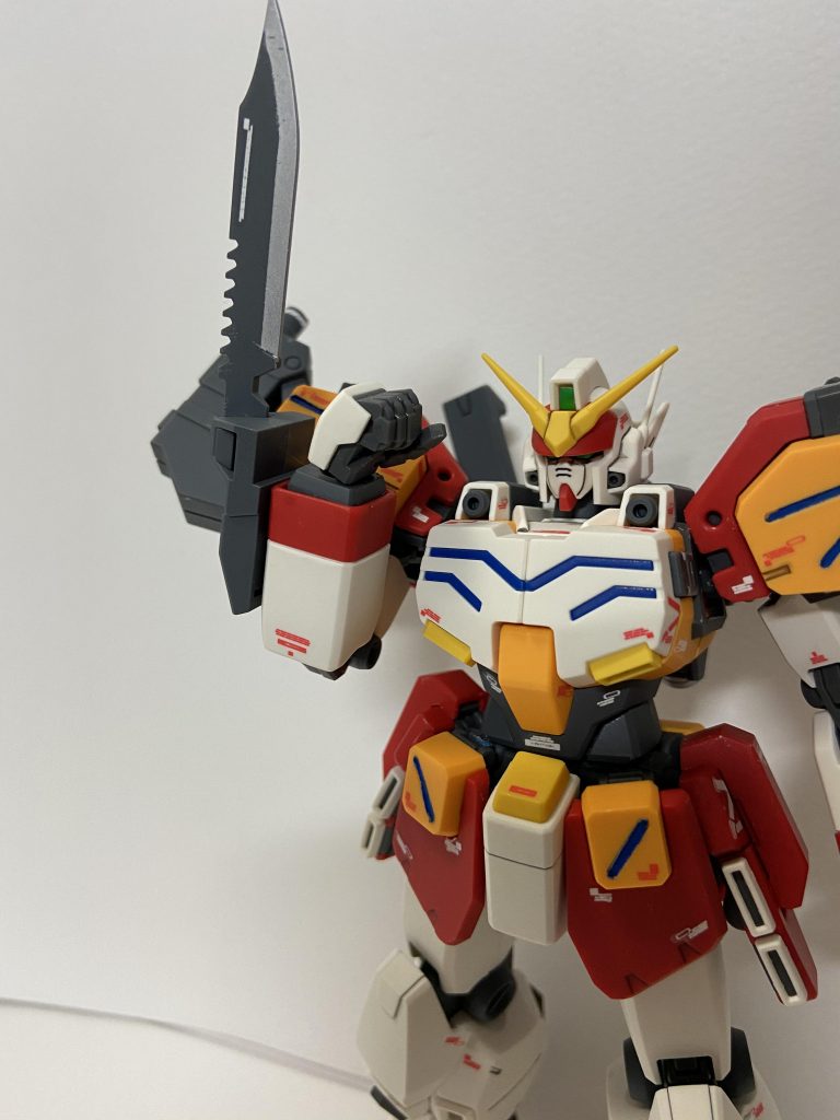 ガトリングの砲身をシルバー、胸や肩、スカート部の青、バックパックのスラスターとアーマーナイフ刀身のシルバー、ミサイルの赤です