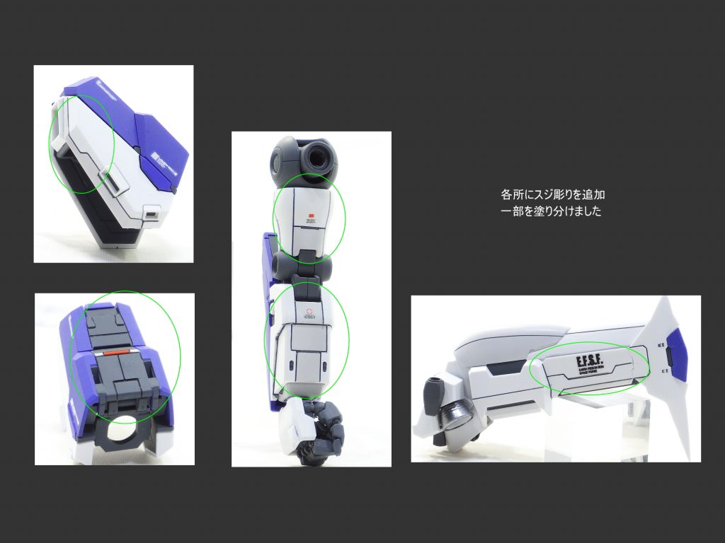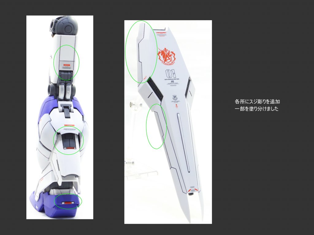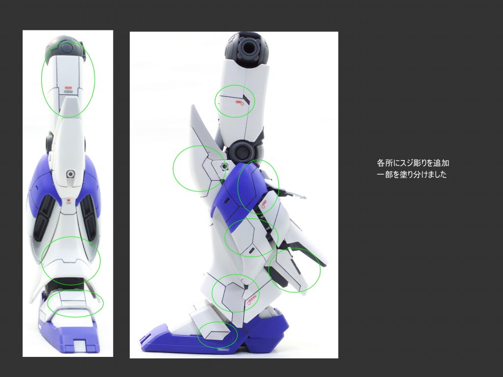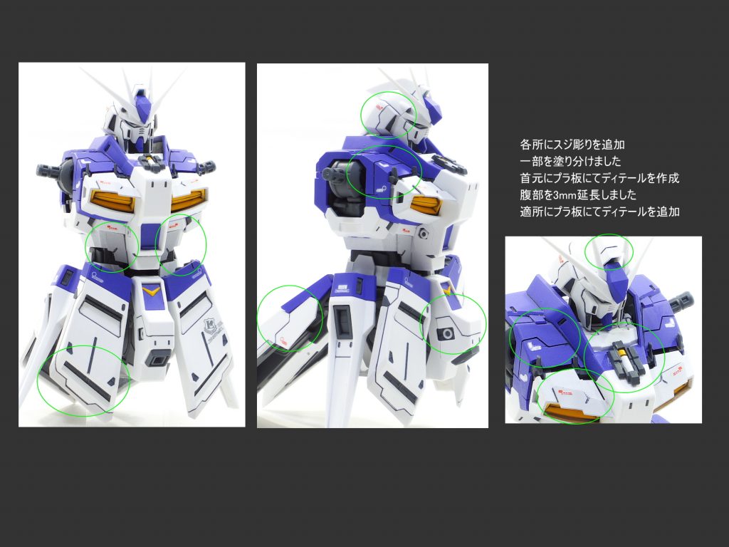 Hi-νガンダムの腹部が短いと思いましたので腹部を3mm延長しました。 その周りにプラ板にてディテールを作成しました。 本体各所にはスジ彫り等を行い塗りわけをして仕上げました。