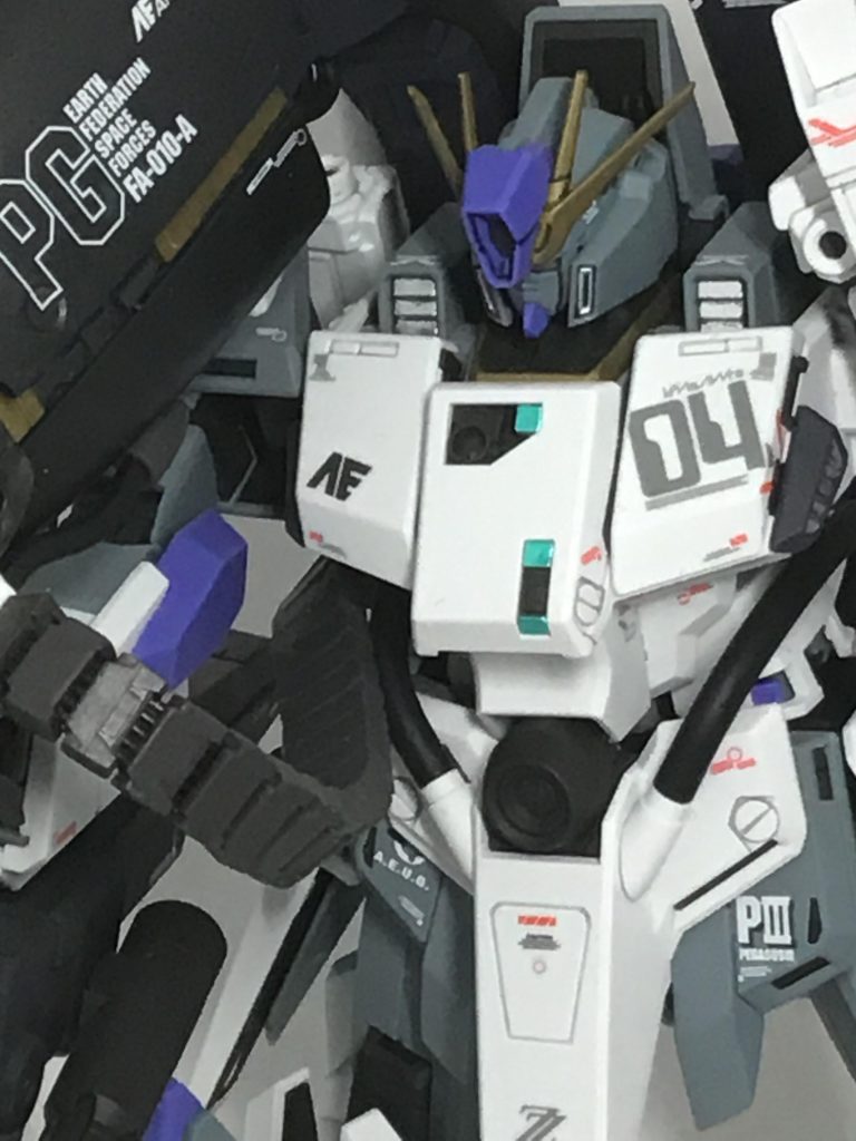 今回、ガンダムデカールのセンチネル用等で各所にマーキングを追加してみました。(腰部のペガサスⅢマークやエゥーゴのマーク、左右スネの外側等)