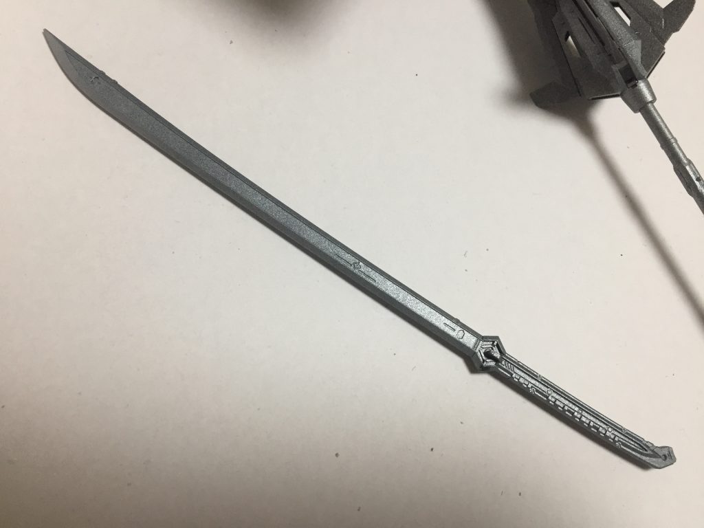 太刀は片方の刃を潰して片刃にし(両刃なら太刀じゃないじゃん…)、光の加減で刃部分だけシルバーに光るよう塗装しました。伝わり難くで申し訳ない…