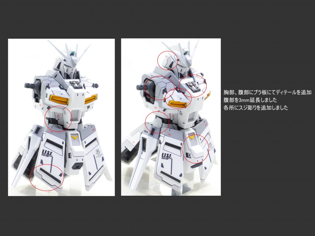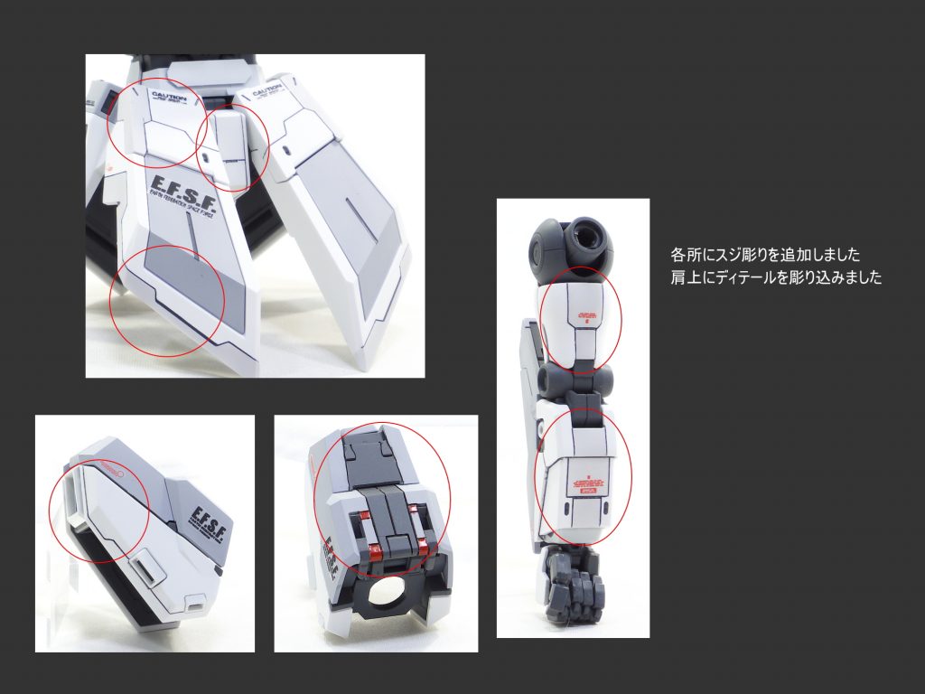Hi-νガンダムをロールアウトカラーのような、カラーリングで製作いたしました。腹部が短いと思いましたので3mm程延長しました。 本体、各所にはスジ彫りやディテールの彫り込みを行いました。