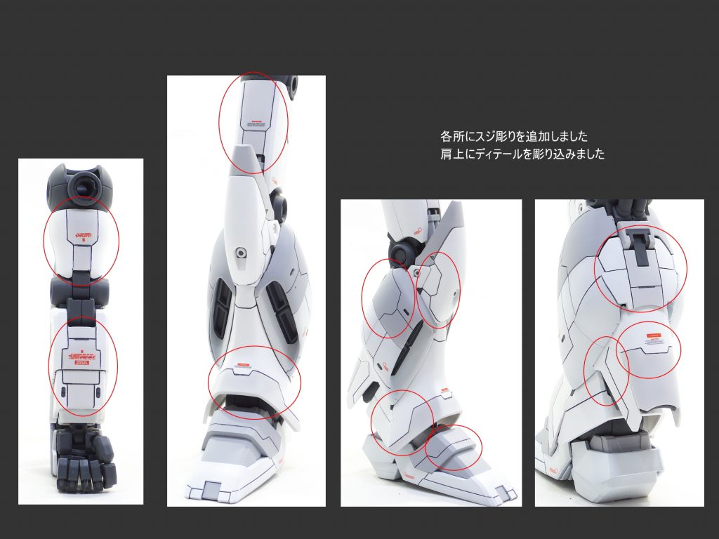 太ももをプラ板にて1mm幅増ししました。 各所にスジ彫りの追…