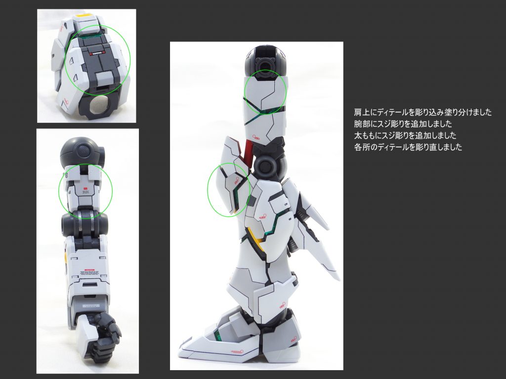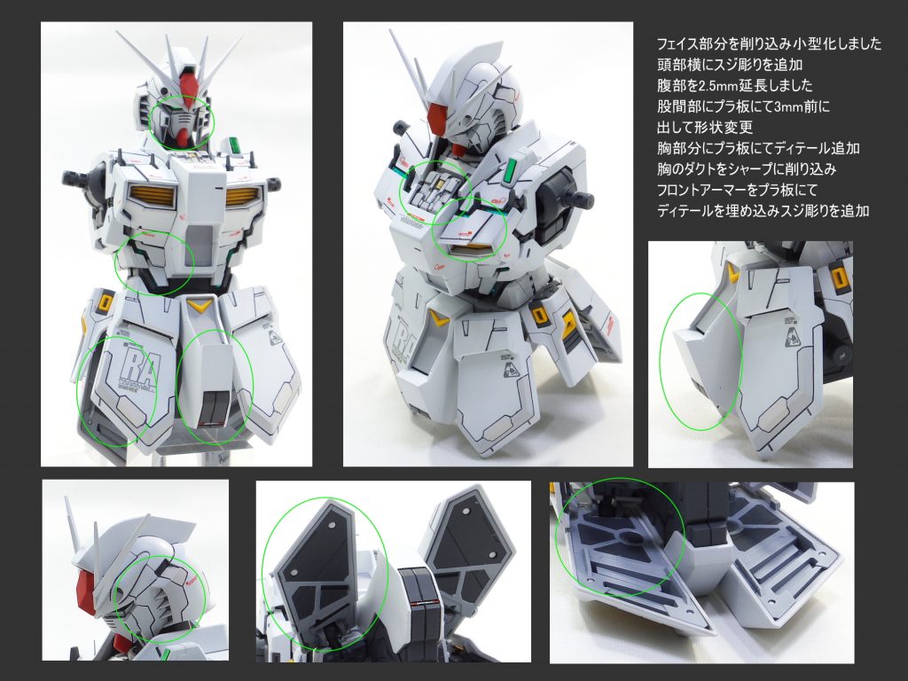 MG νガンダム ver.kaを製作しました。 フェイスが面長でしたので削りこみ小型化しました。 腹部を2.5mm延長し短さを解消しました。 股間部をプラ板にて前面に3mm延長し形状変更しました。 胸部、腹部にはプラ板にてディテールを追加しました。 フロントアーマーにプラ板にてディテールを埋め込み、スジ彫りを追加しました。