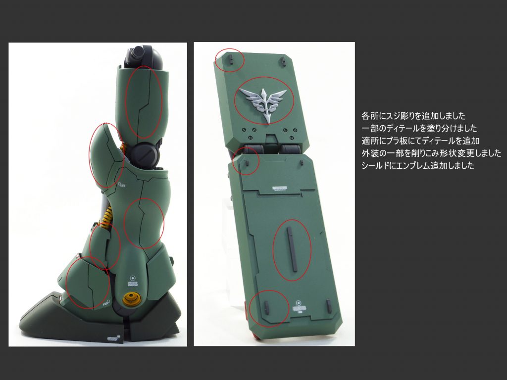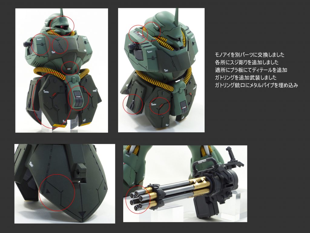 MG ギラドーガを製作いたしました。 全体的にスジ彫りやディテールを彫り込みを行い 一部のディテールを数色を使い塗り分けました。 適所にプラ板にてディテールを追加しました。 ガトリングガンを追加し武装強化しました。