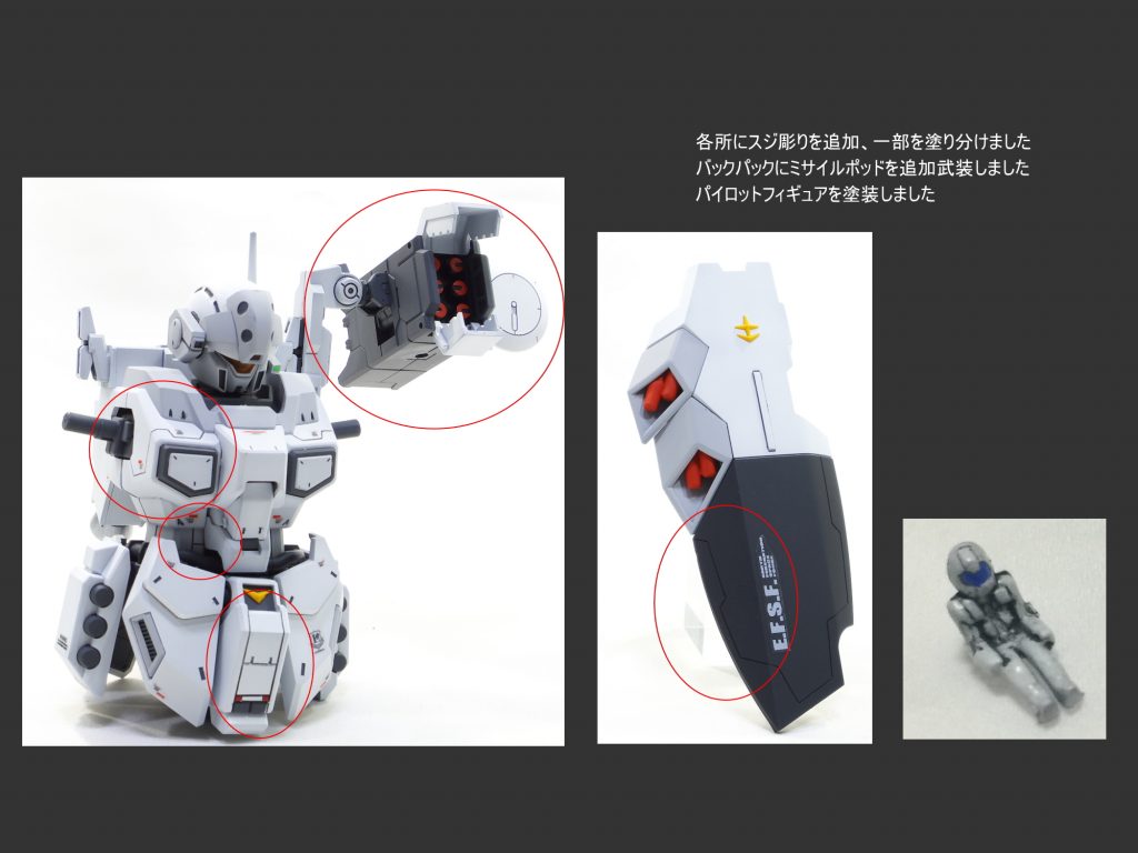 MG ジェスタを製作しました。 ジェスタのシールド取付ジョイントを使用して ミサイルポッドを追加武装として追加いたしました。 ジェスタの適所にディテールの彫り込みによる 塗りわけ箇所の製作やスジ彫りにて ディテールを追加いたしました。