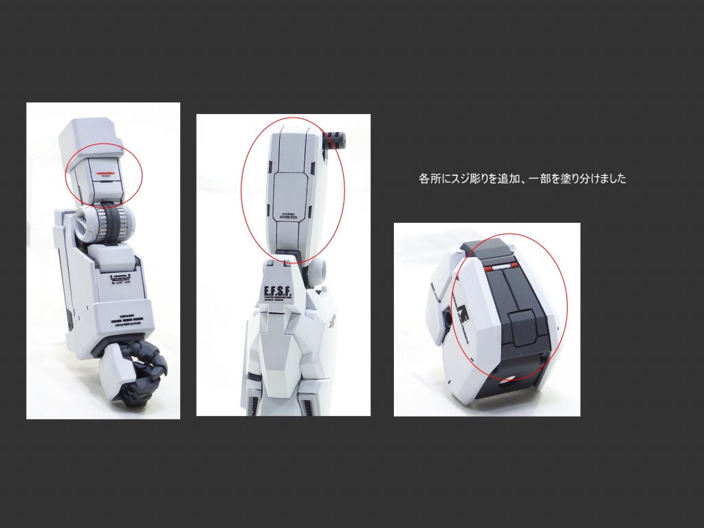 太ももをプラ板にて1mm幅増ししました。 各所にスジ彫りの追…