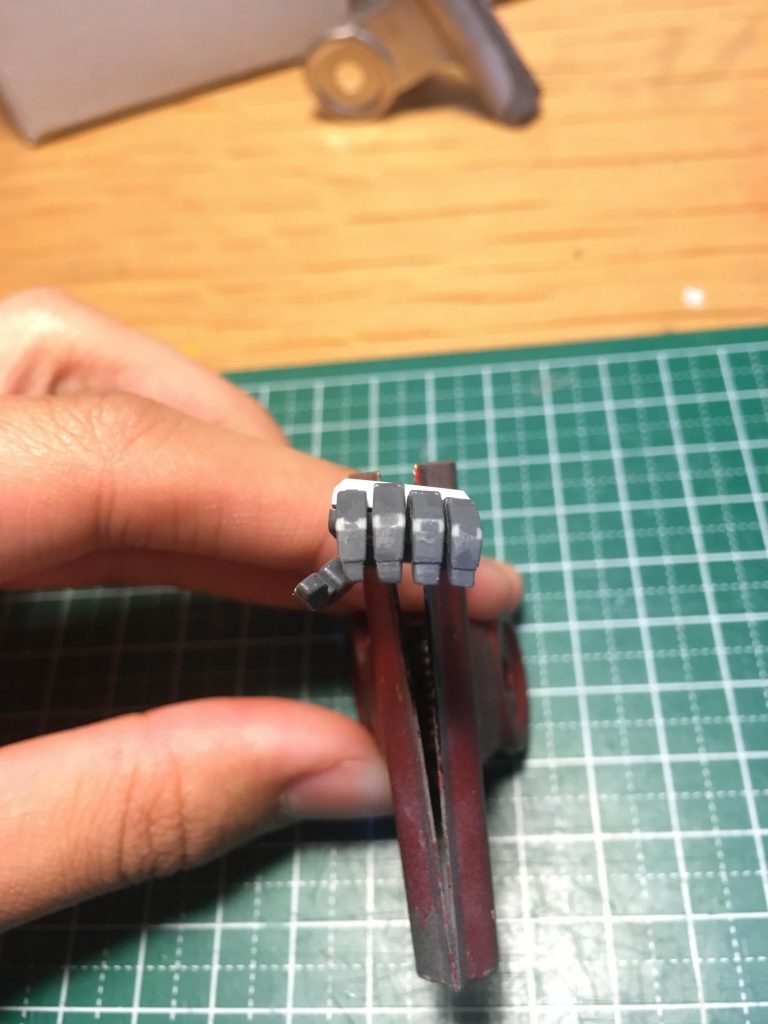 今回行った作業の中でも一番こだわったのが指先の塗り分けです。藤岡建機氏の描くマニピュレーターを再現するべく段落ちのディテールを作り、塗り分けました。