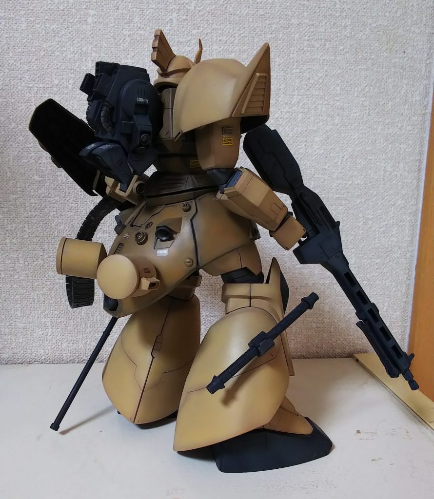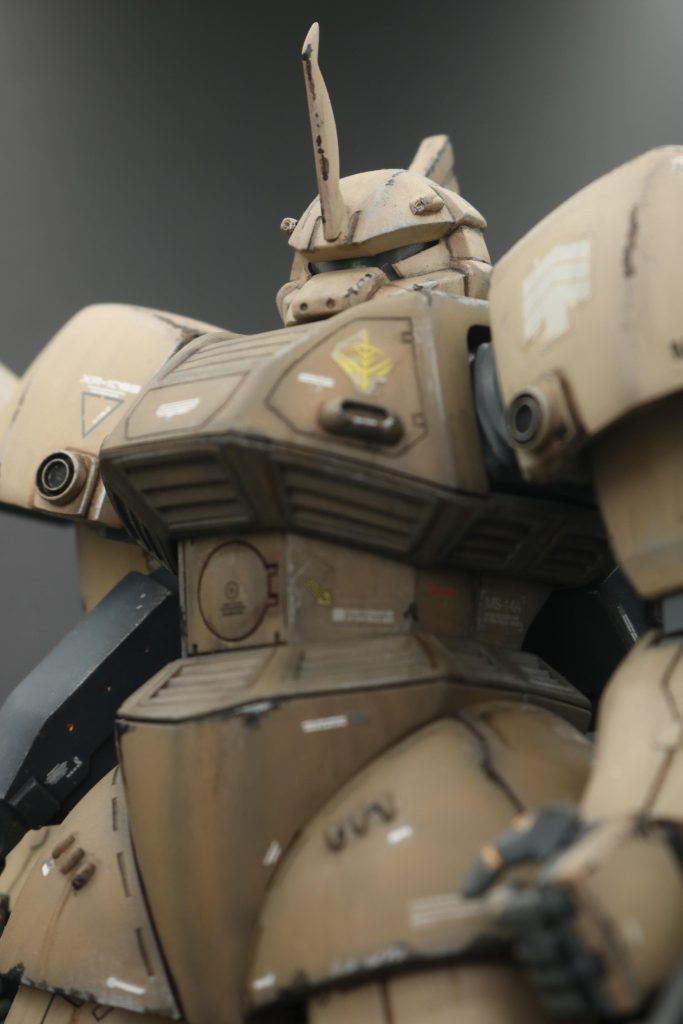 キットは量産型ゲルググですが、コンセプトとしては陸戦型として制作いたしました。十年以上前に完成させていたのですが、今回新たにウェザリングを施し、デカールも追加してみました。