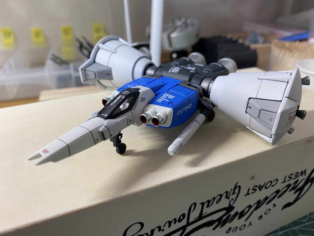 全体的にはつや消し仕上げとしましたが、バーニアは黒サフ+メタリック塗装+光沢塗装を施しました。下地によってメタリック仕上げの質感が変わることに感動しました。