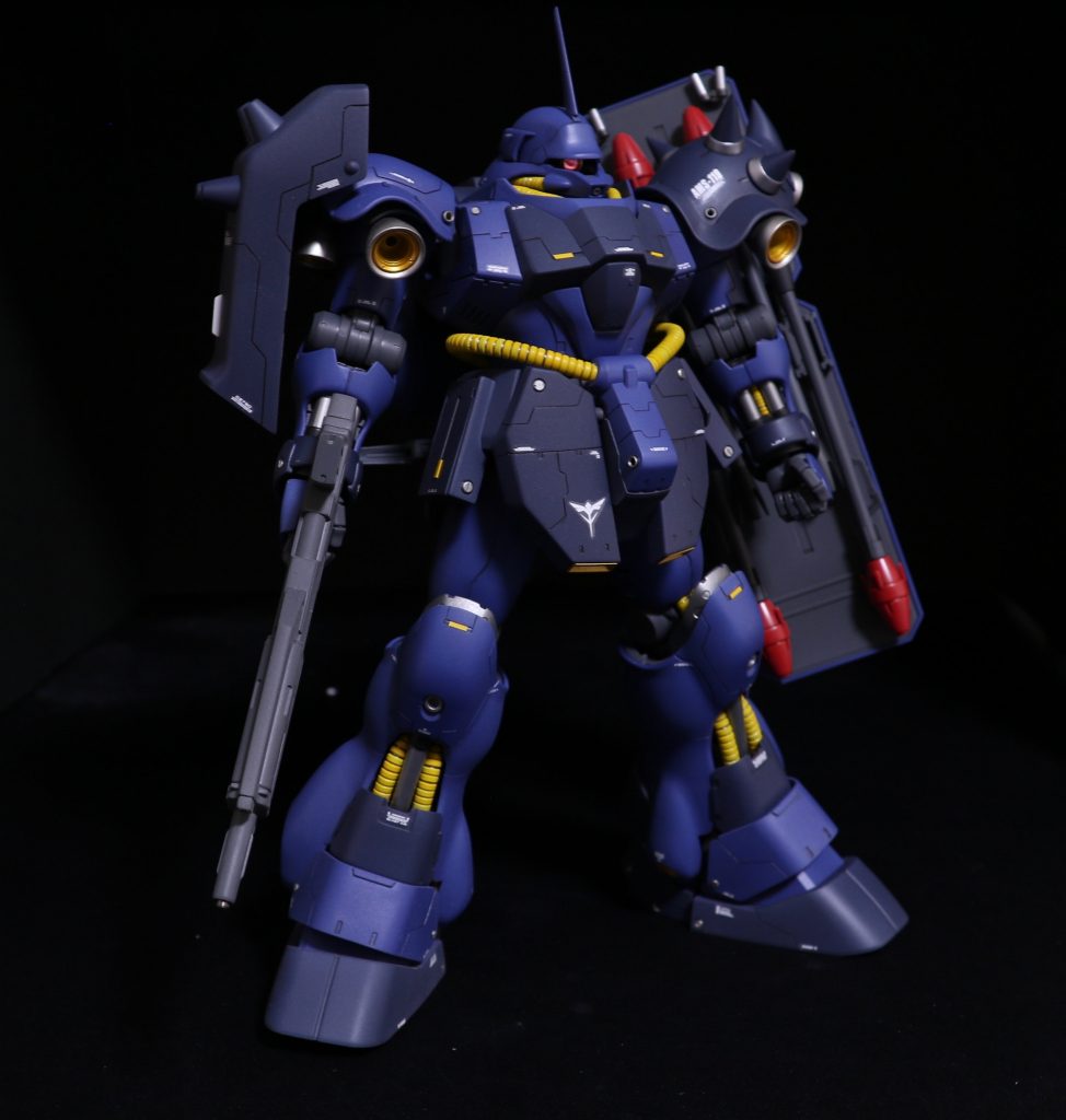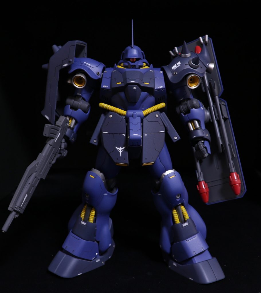 AMS-119 ギラドーガ MG1/100を作成しました。 レズン・シュナイダー専用機ですががオリジナルカラーよりもダークな色合いに塗装してみました。部分的なイエローとゴールドパーツでコントラストを狙いました。