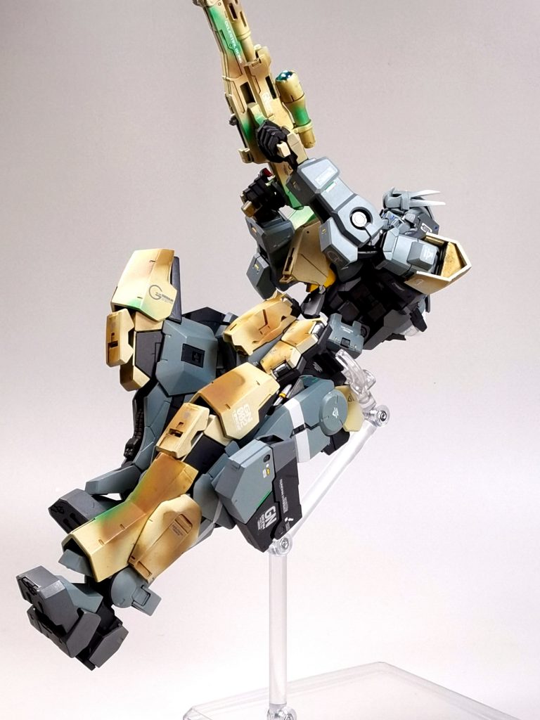 右下腿の追加装甲もありますが、狙撃姿勢がとりやすいように左右非対称で装着。地味な本体部分には赤青黄色緑と差し色を複数使用。本体の汚しは少なめに