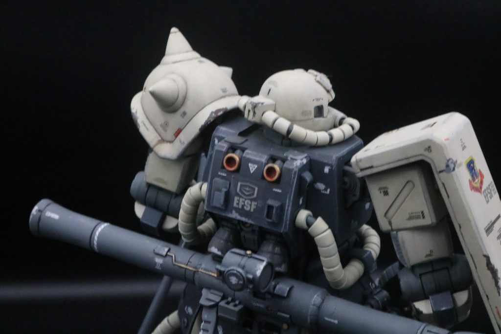 脚部のバーニアのようなディティールに合わせて追加された、シールドのディティールが、MS06最後期型的なニュアンスをより高めてるように感じます。