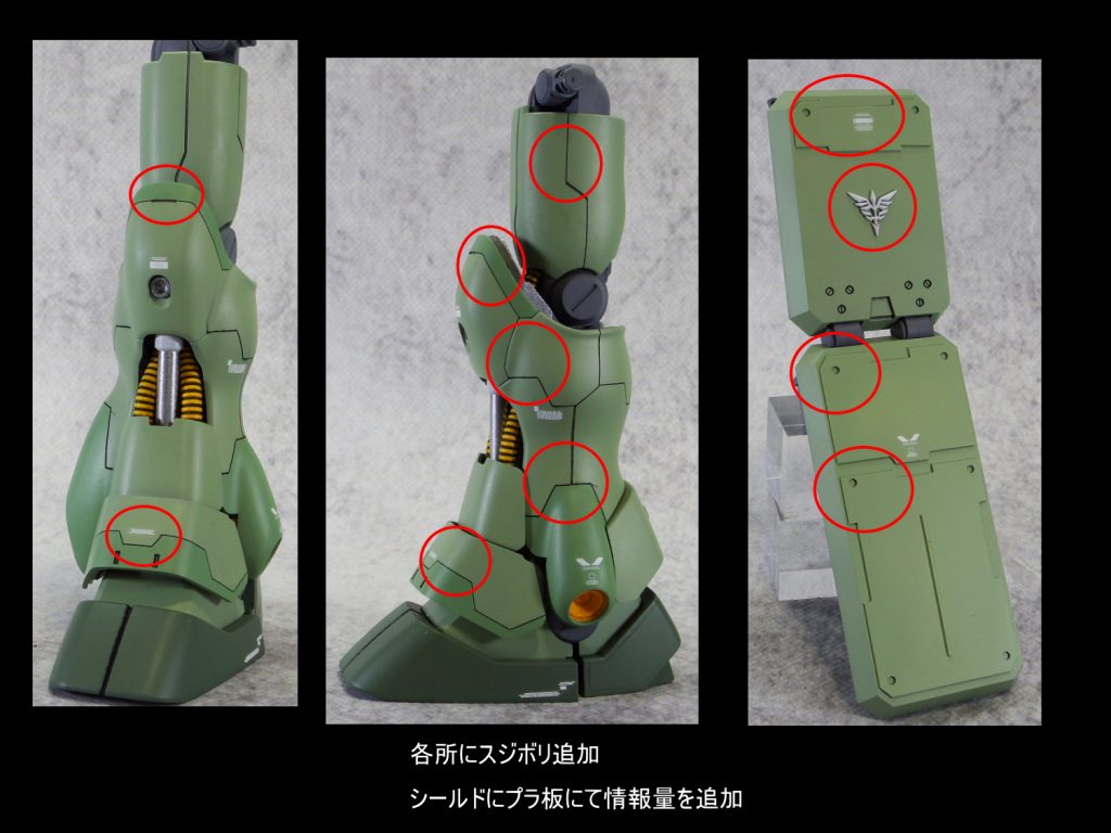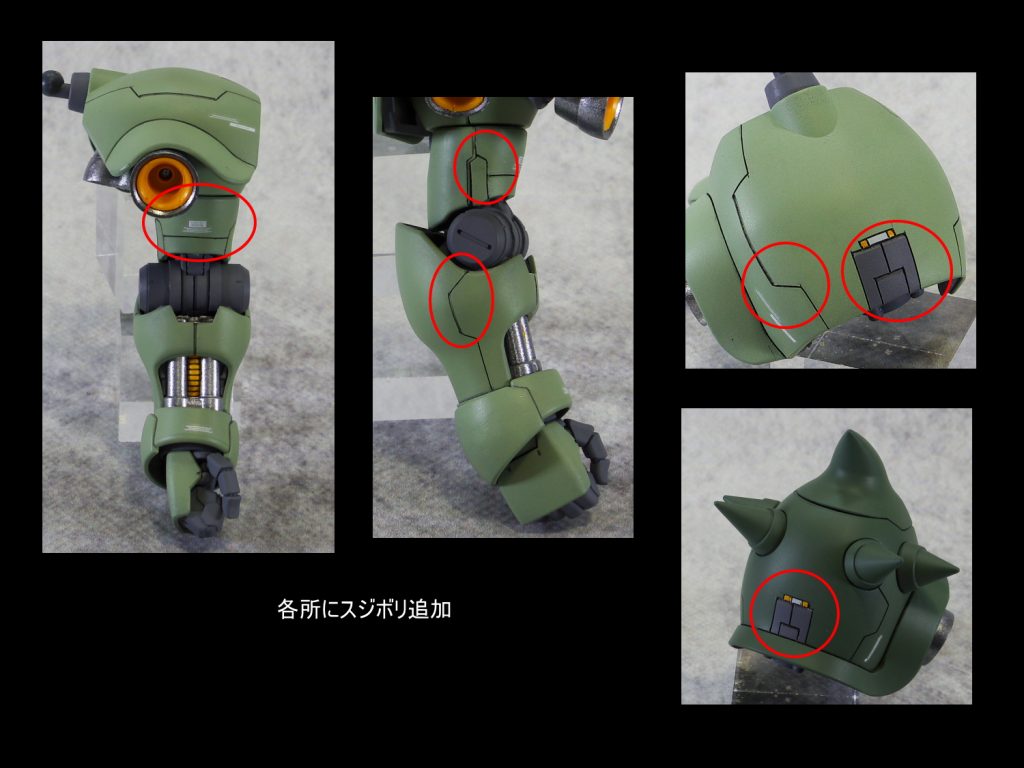 太ももをプラ板にて1mm幅増ししました。 各所にスジ彫りの追…
