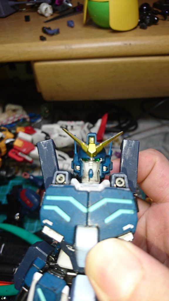 全身にドライブラシを施してエンドレスワルツのボドボド感を出してます。水性塗料を筆につけて、ティッシュで塗料をほぼ拭き取ってから機体に擦り付けるだけの簡単作業。永遠の蒼さんのブログを参考にしました。