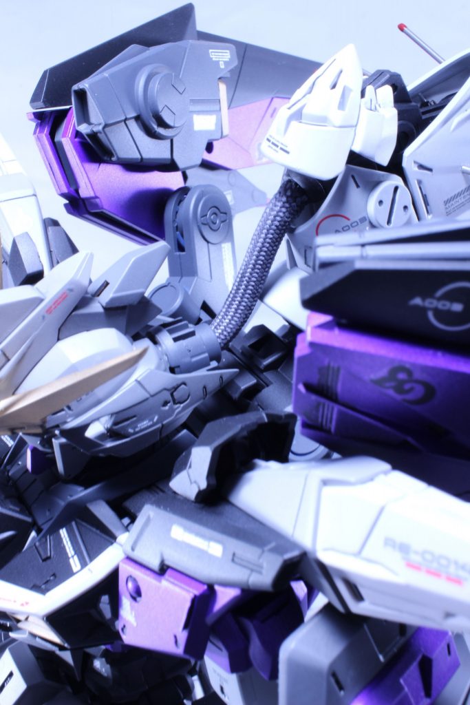 カラーがなかなか決まらず、最終的に偶然見つけたクレオスのメタリックバイオレットを使用。その時点でスワロウテイル案が出ましたが一旦保留。のちにウィングが完成した時にスワロウテイルしかない!と決定しました。ジャスティス自体非常に(自分的に)セクシーかつエロティックな機体ですので、マッチしてるのではないかと思います😊