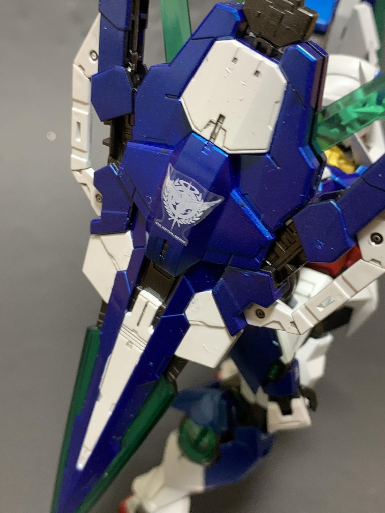 各部のマーキングに関してはメタリック塗装が逆に映えないかなと思って、ソレスタルビーイングのエンブレム以外は控えめに貼っています。